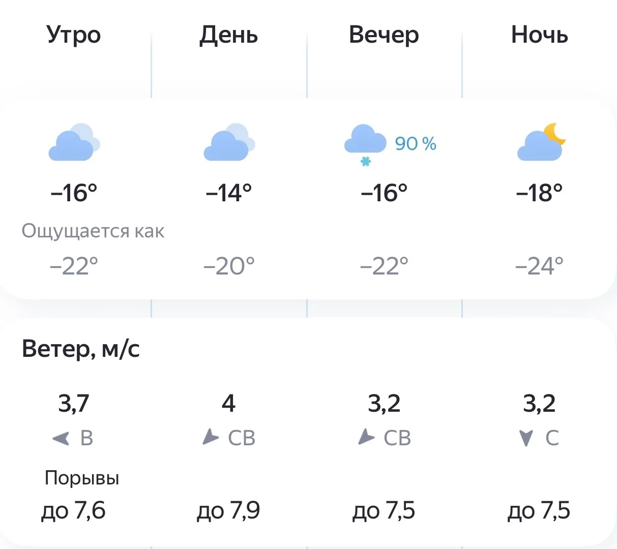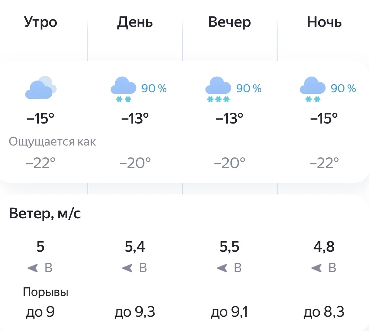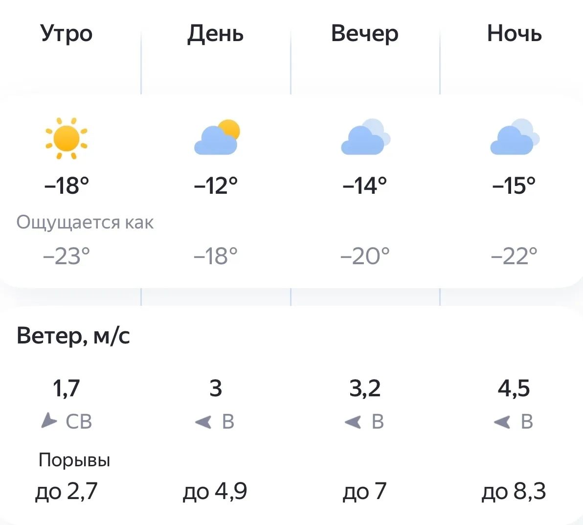 • 25 февраля сохранится переменная облачность, но осадков почти не будет: ночью −17…−19, днём −13…−15, ветер станет юго‑восточным.
