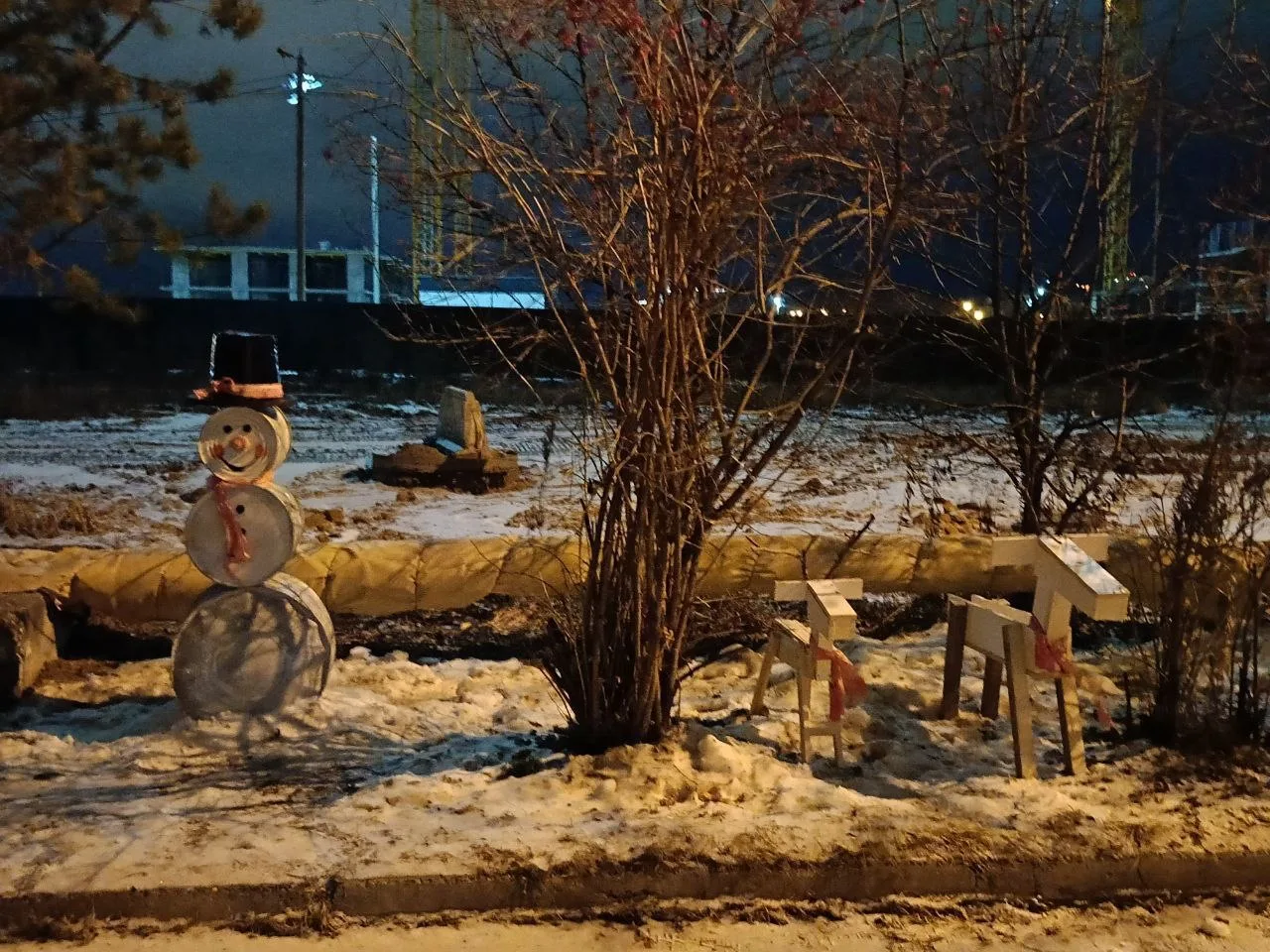У дома на Камчатской обосновался железный снеговик, а с ним и два оленя рядом.