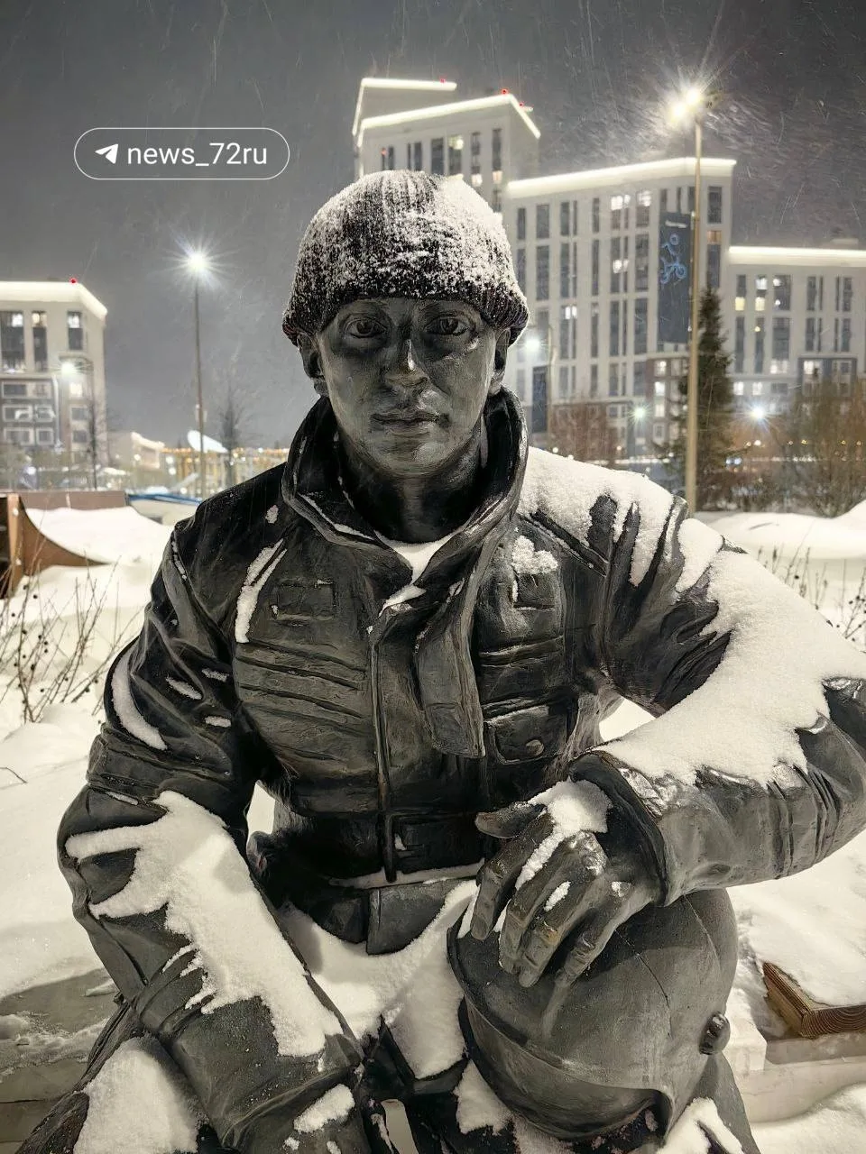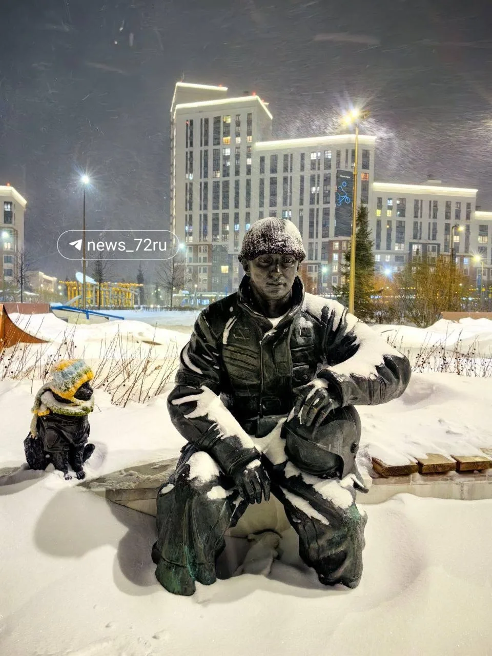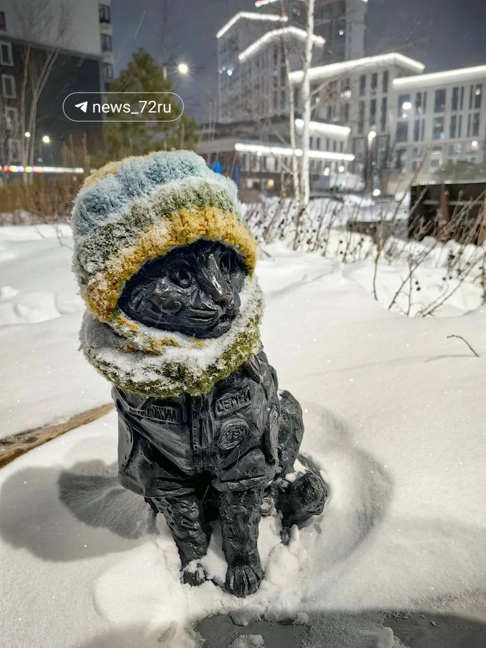 Уюта и милоты в это зимнее утро🥹Тюменцы утеплили котика Семена на бульваре Пожарных и Спасателей.