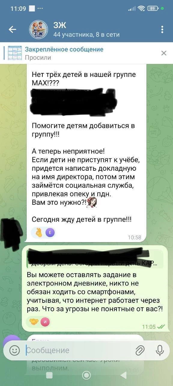 «До чего дошли... Связи нет, но должны заниматься, а если не выйдешь на связь -опека, пдн и тд., что вообще происходит?! А когда начинаешь отвечать, предлагают перевестись в другой класс! У меня трое детей и я первый раз встречаю такого педагога! Просто шок!»,