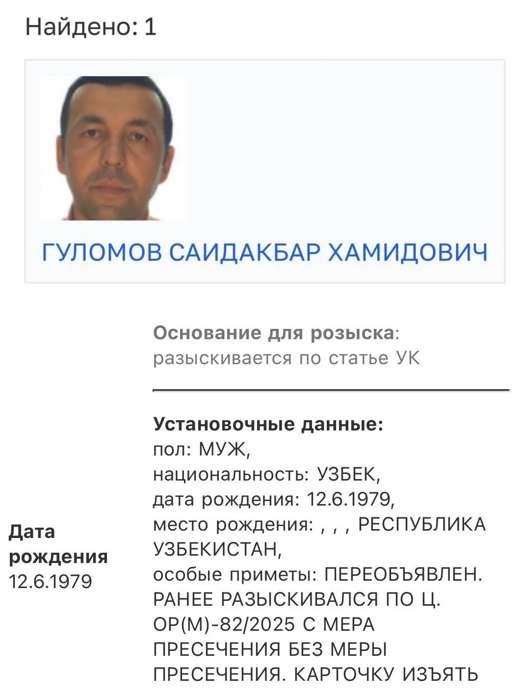 Исполнитель был завербован в интересах украинских спецслужб функционером ИГ Саидакбаром Гуломовым (1979 г.р.), находящимся в международном розыске по линии России и Узбекистана.
