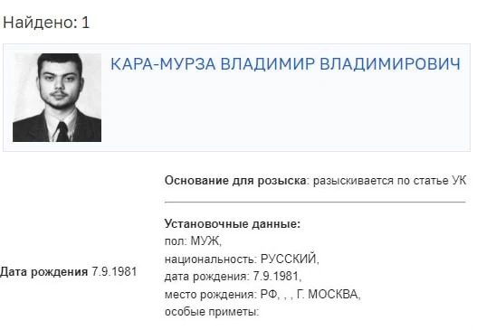 Политика-иноагента Владимира Кара-Мурзу объявили в России в розыск, информация об этом размещена в базе МВД.