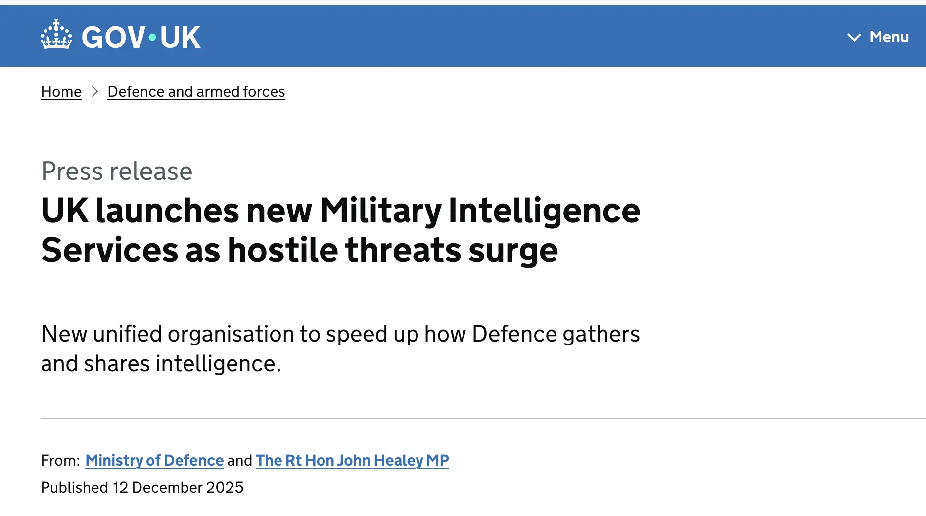 Министерство обороны Великобритании объявило о создании новой Военной службы разведки (Military Intelligence Services, MIS), в которую войдут разведывательные подразделения всех родов войск, включая ВВС и ВМФ. Реформа проводится «в условиях роста угроз для Великобритании» и призвана помочь в борьбе с «враждебными государствами и террористами», говорится в заявлении Минобороны.