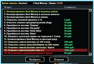 - Есть своя бонусная экономика аля донат, /rdonate /donat /donate можно купить все что угодно на сервере, а это редкий транспорт, скины, админки, лидерки, хелперки, аксессуары, и многое многое