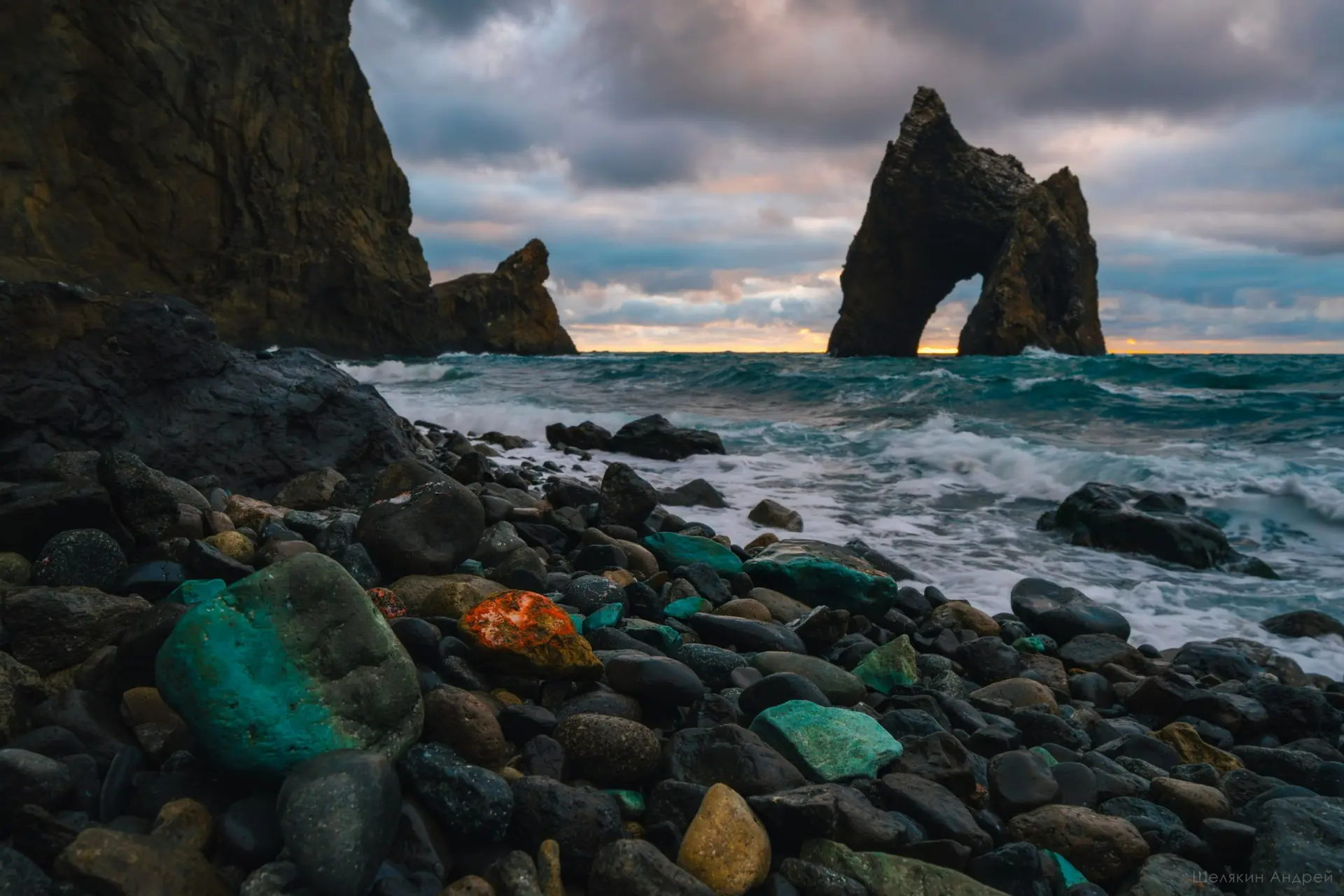 В кадр попали камни под названием Трасс карадагский. Это вулканическая зеленая порода, которая сформировалась примерно 160 миллионов лет назад. Его используют в цементной промышленности, в производстве сувениров и украшений. Камушек красного цвета похож на яшму.