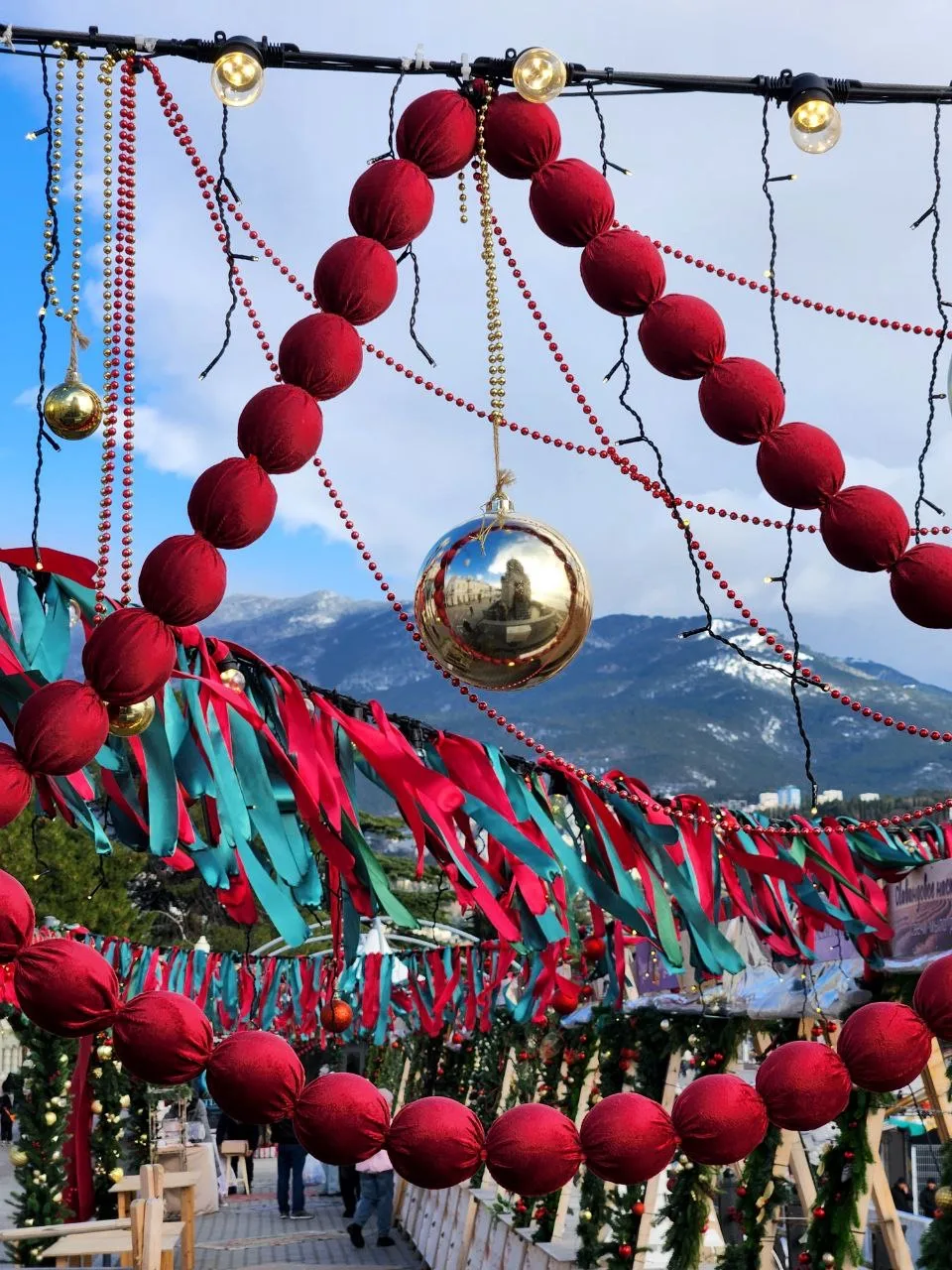 В сквере у Дворца культуры профсоюзов в Симферополе появилась необычная новогодняя ёлка высотой семь метров. Она сплетена из ярко-красных поролоновых нитей и украшена разноцветными пуговицами.