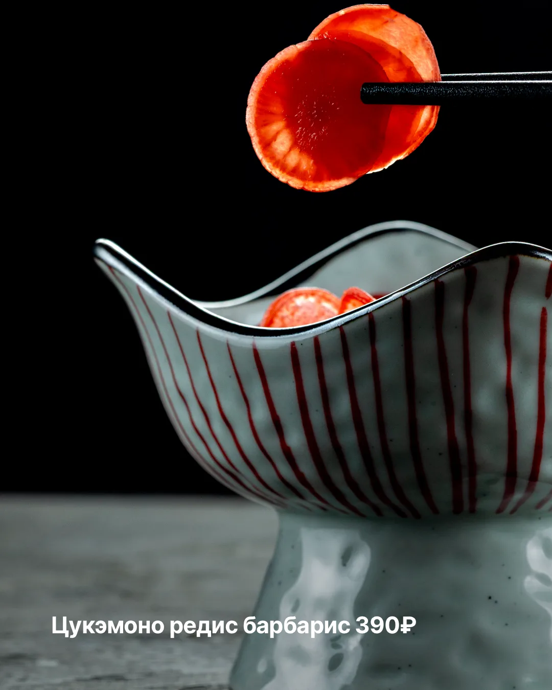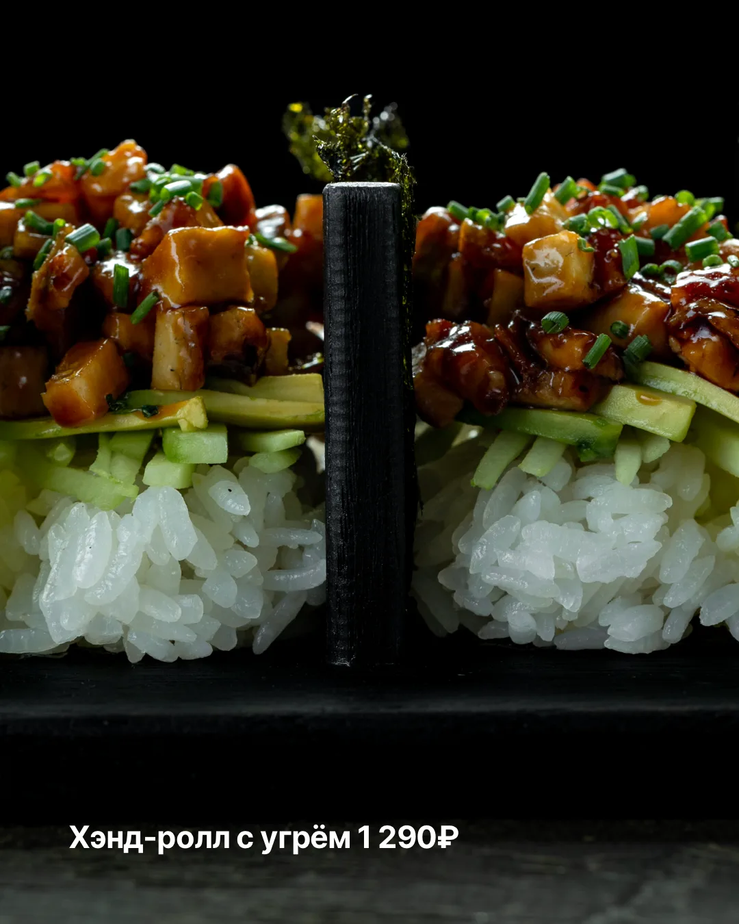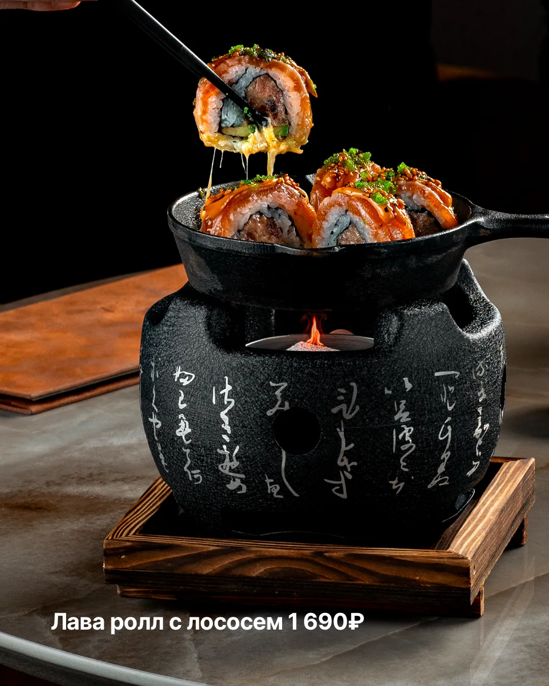 Также в меню — эффектный лава-ролл с лососем на раскалённой сковороде, хэнд-ролл с угрём и маринованный редис с барбарисом.