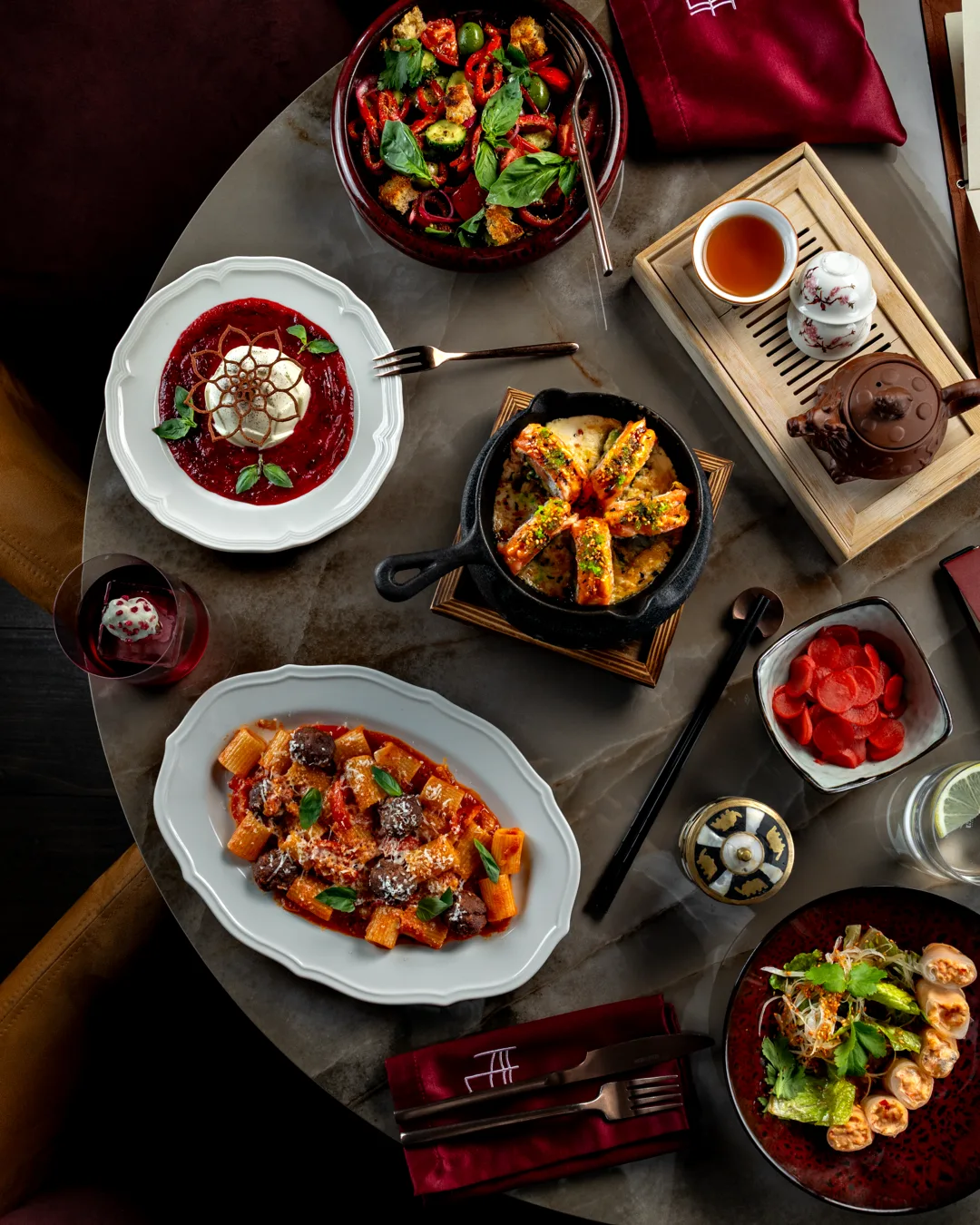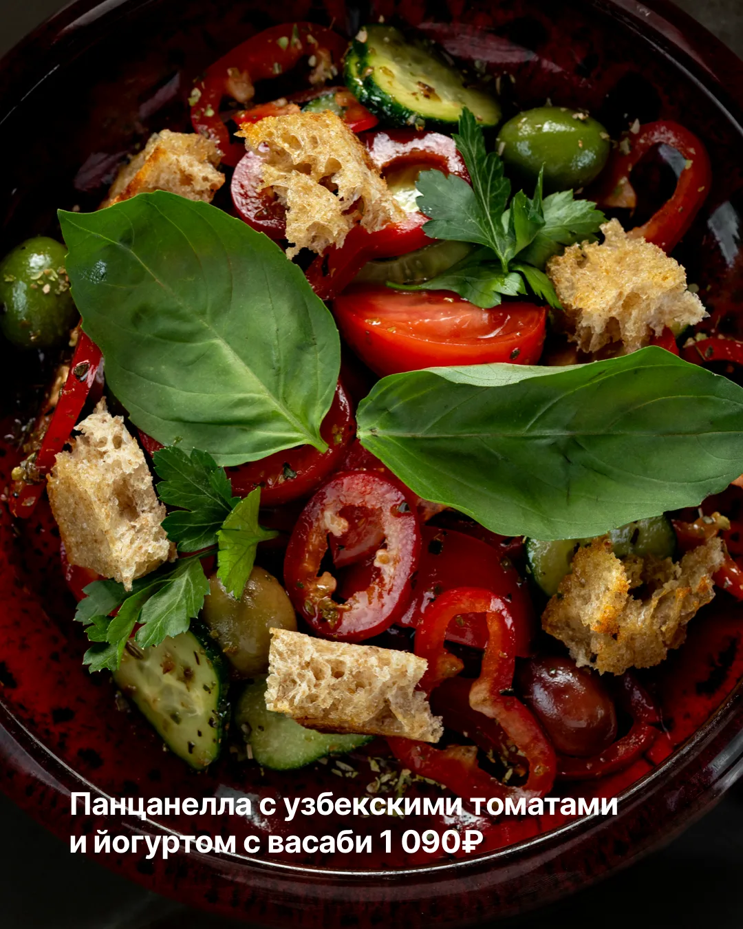 Среди новинок: панцанелла с узбекскими томатами и йогуртом с васаби, салат со спринг-роллами с угрём и креветкой, ригатони с митболами из вагю.