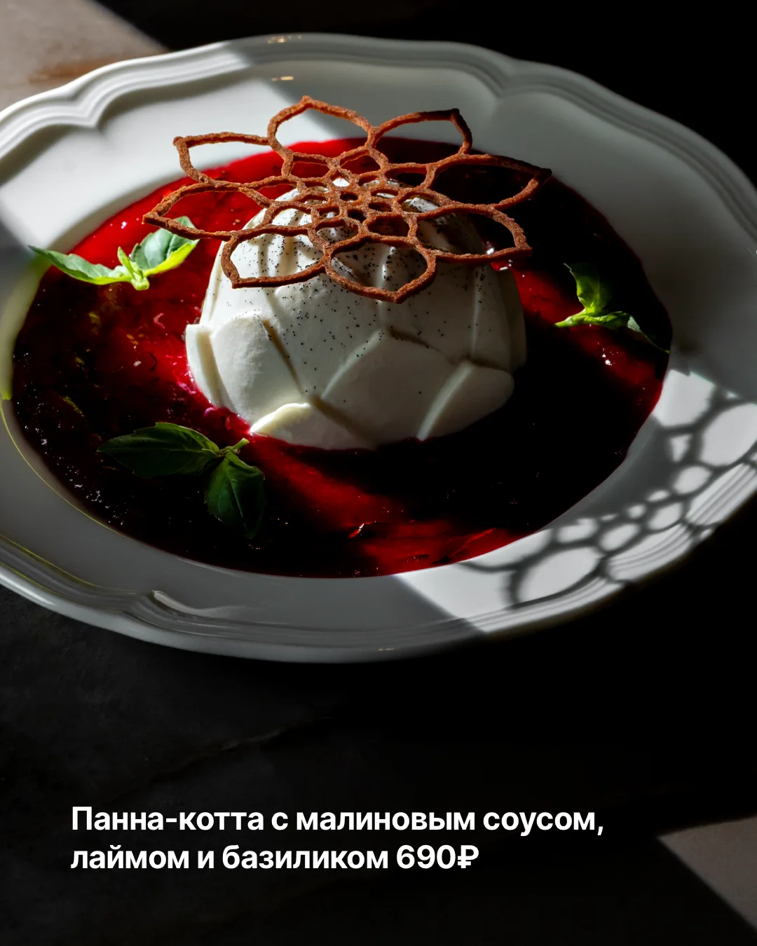На десерт — панна-котта с малиновым соусом, лаймом и базиликом.
