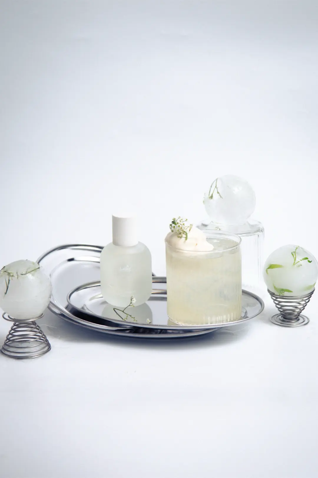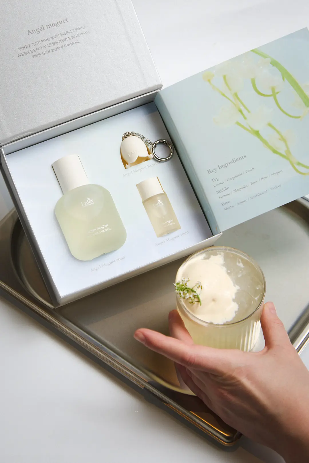 В центре — авторский напиток крем-сода с цветочным мороженым (550 ₽), вдохновлённый новым парфюмированным маслом Perfumed Hair Oil Angel Muguet.