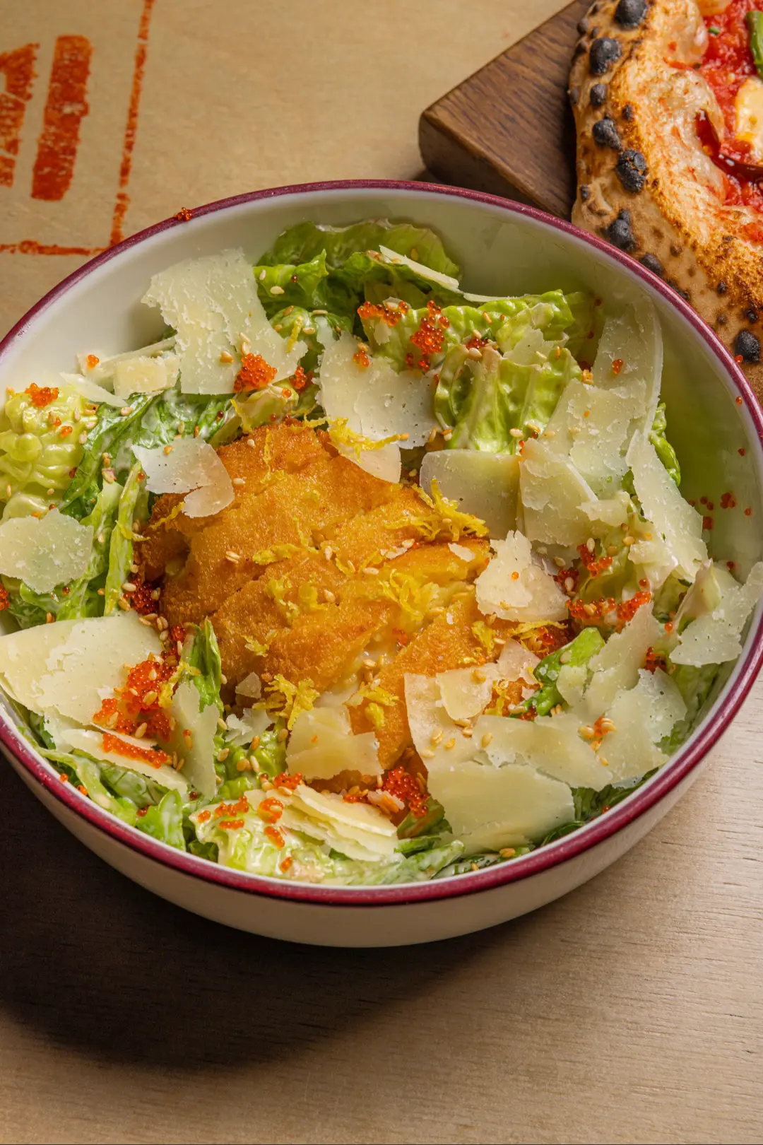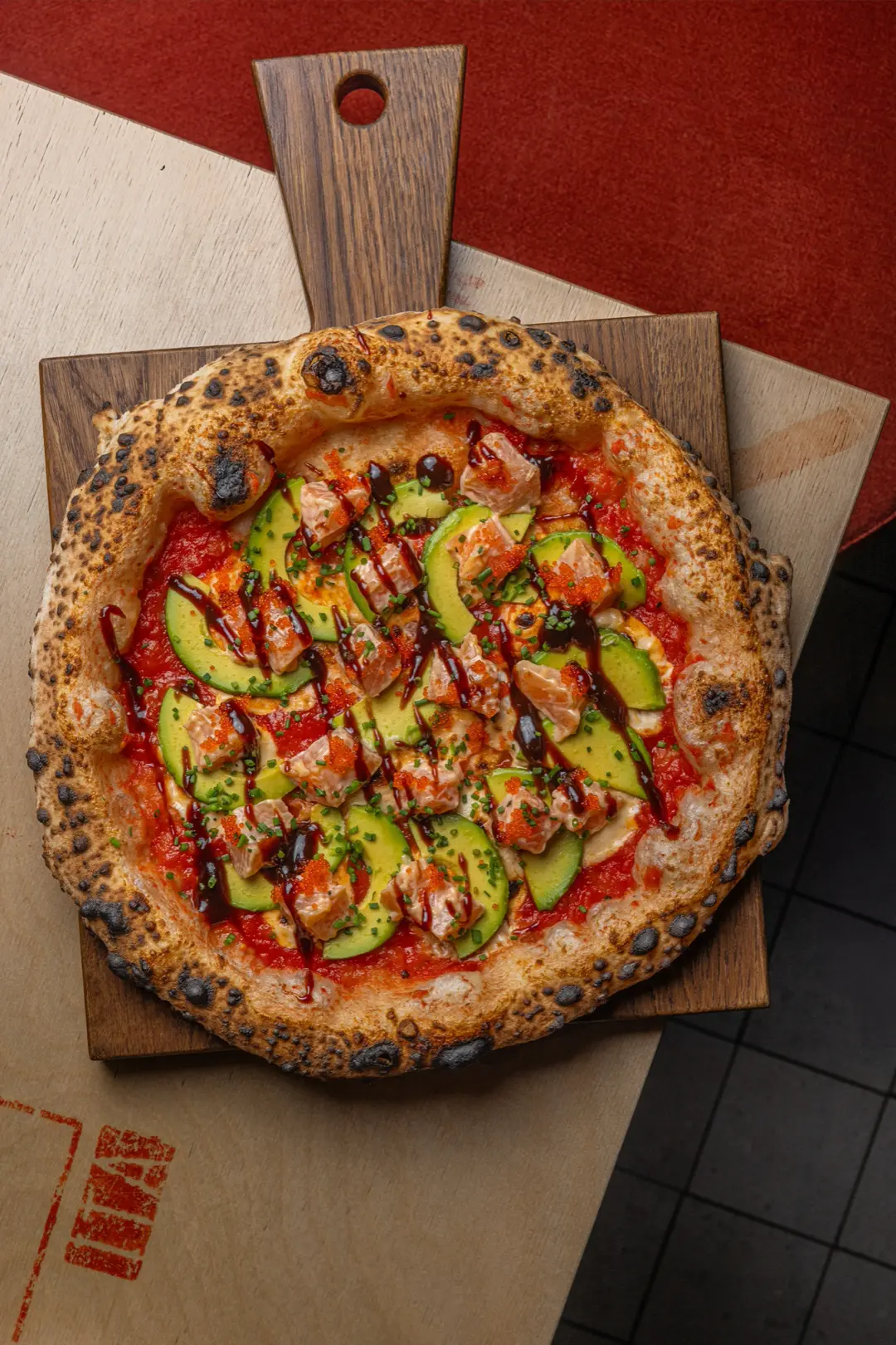 Шефскую пиццу месяца (950₽) придумал Егор Калинин — с лангустинами, цукини, таледжио, вялеными томатами, оливками и томатным соусом с кимчи.