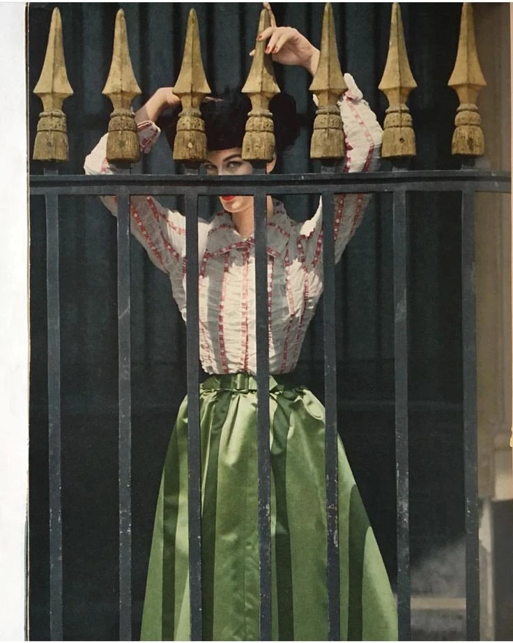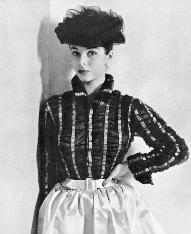 У Balenciaga Баленсиаги есть очень похожая модель в несколько другом цветовом решении - где блузка комплекта тёмная, а юбка из ткани более светлого оттенка, фото черно-белое. Balenciaga Collection Haute Couture Automne Hiver 1954-55. Photo Yurek. Коллекция от Баленсиага, высокая мода, осень-зима 1954-1955, фото Юрека.