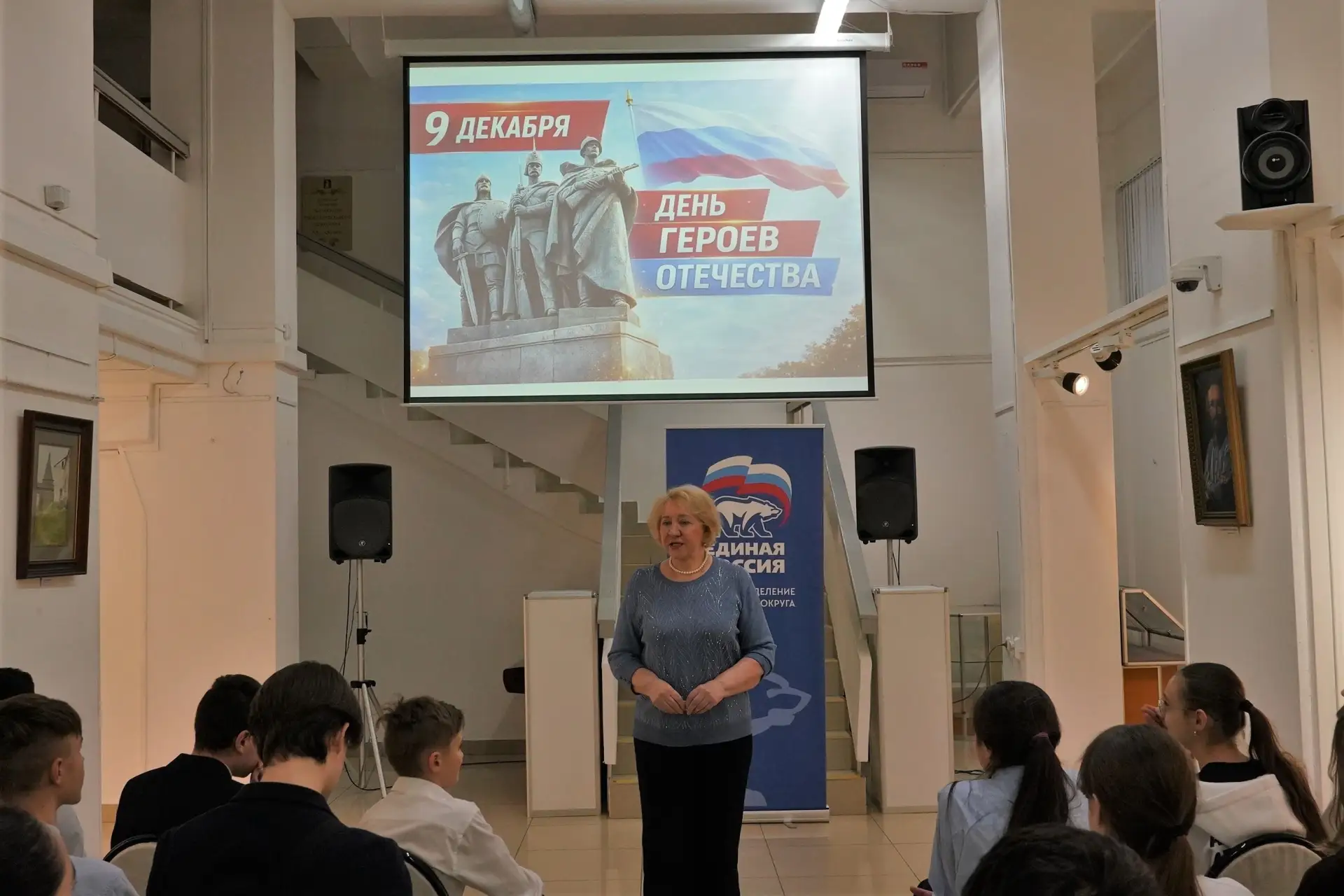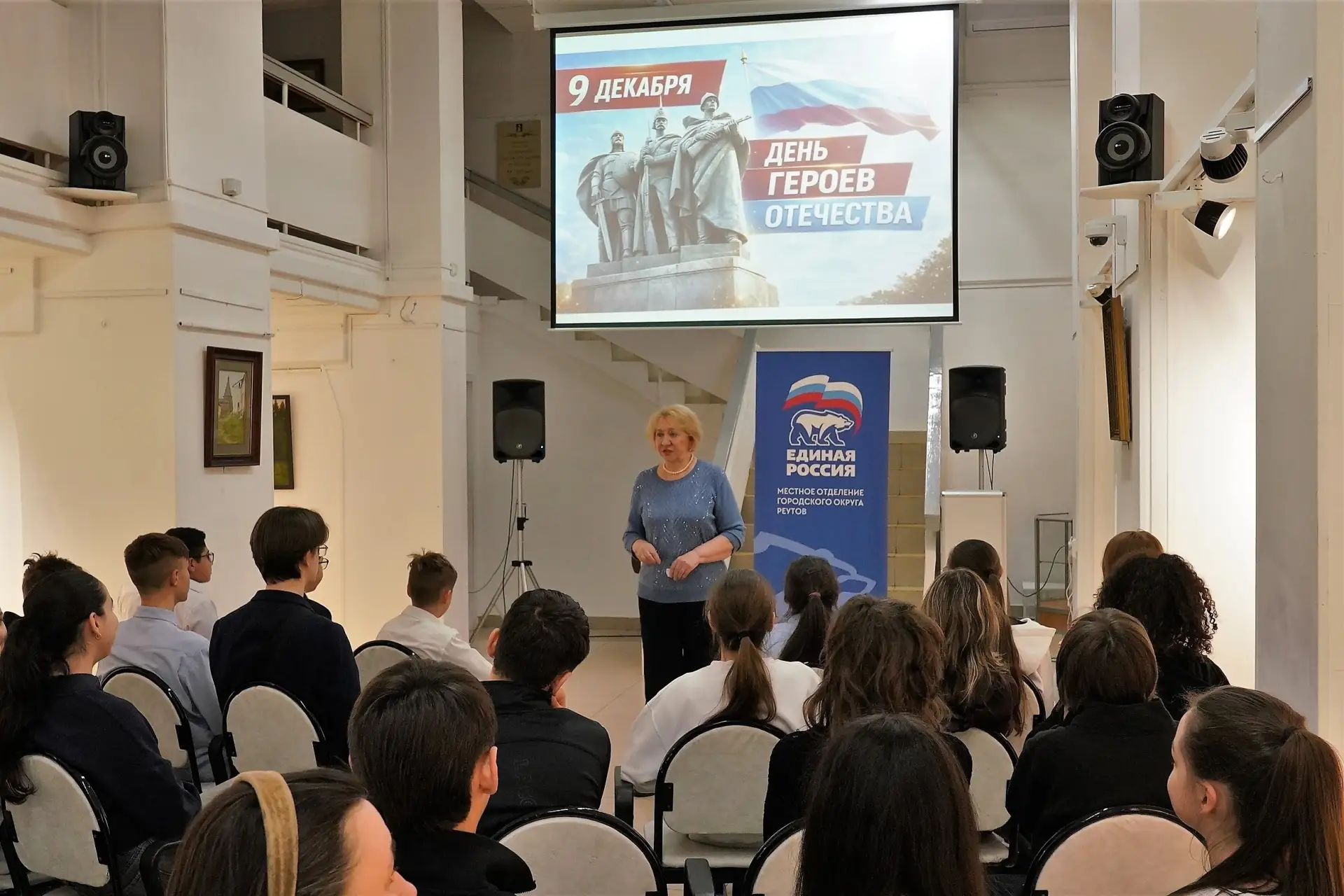 В среду, 10 декабря, в Музейно-выставочном центре Реутова для учащихся Гимназии состоялся Урок мужества, посвящённый всероссийскому Дню героев Отечества. Мероприятие организовано директором МВЦ Антониной Кошкиной в рамках федерального проекта «Историческая память» партии «Единая Россия».