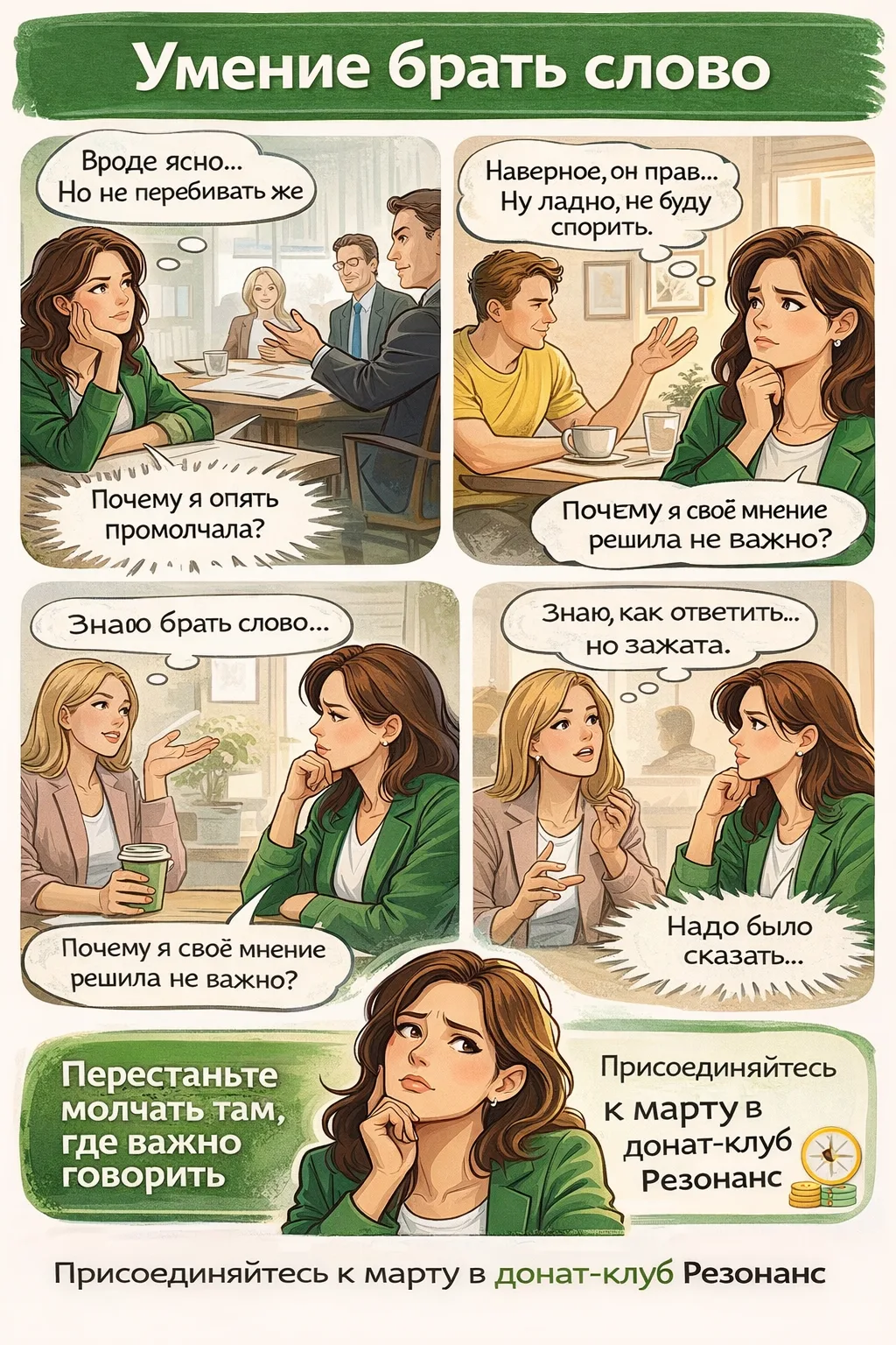 Тут всё, что может пригодиться, если хочешь говорить уверенно, звучать сильнее, выступать без дрожи и общаться по-настоящему. Советы, разборы, посты с теплом и смыслом. Это Резонанс. Подключайся.