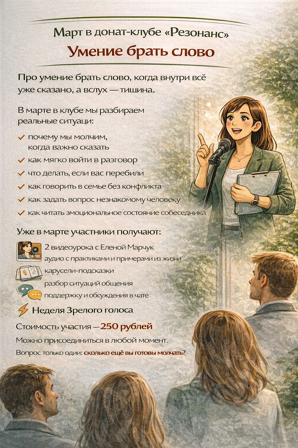 Если вам важно не просто уметь говорить, а сохранять контакт с близкими и с собой, вам будет близок формат нашего донат-клуба 🌿 Мы начинаем важный этап в клубе, твой выбор - присоединиться к нам: vk.cc/cQw0S9