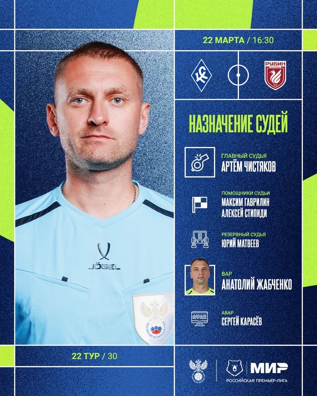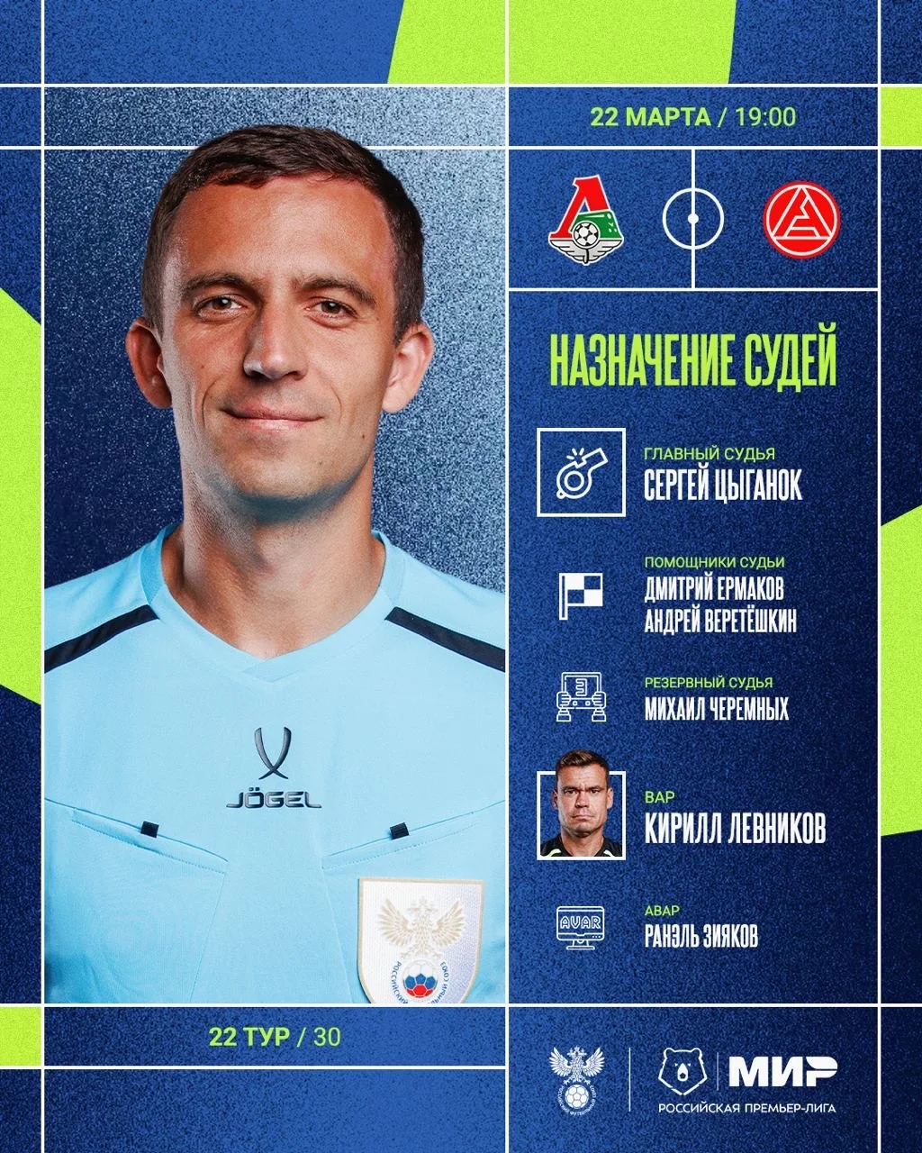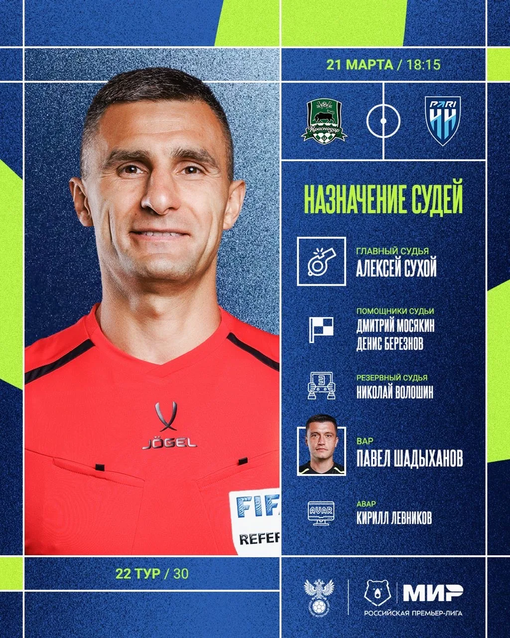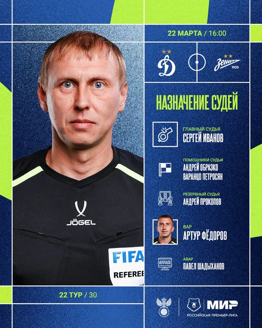 РФС публикует назначения арбитров на 22-й тур Мир РПЛ.