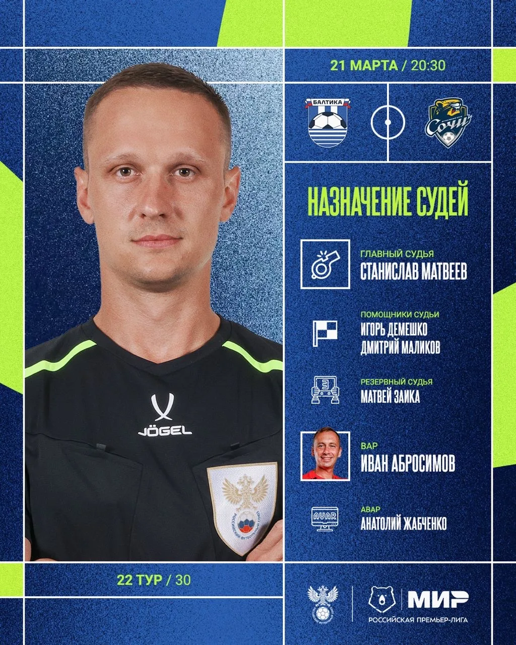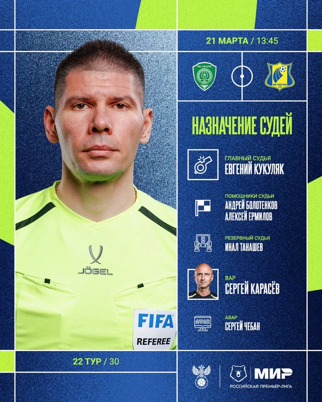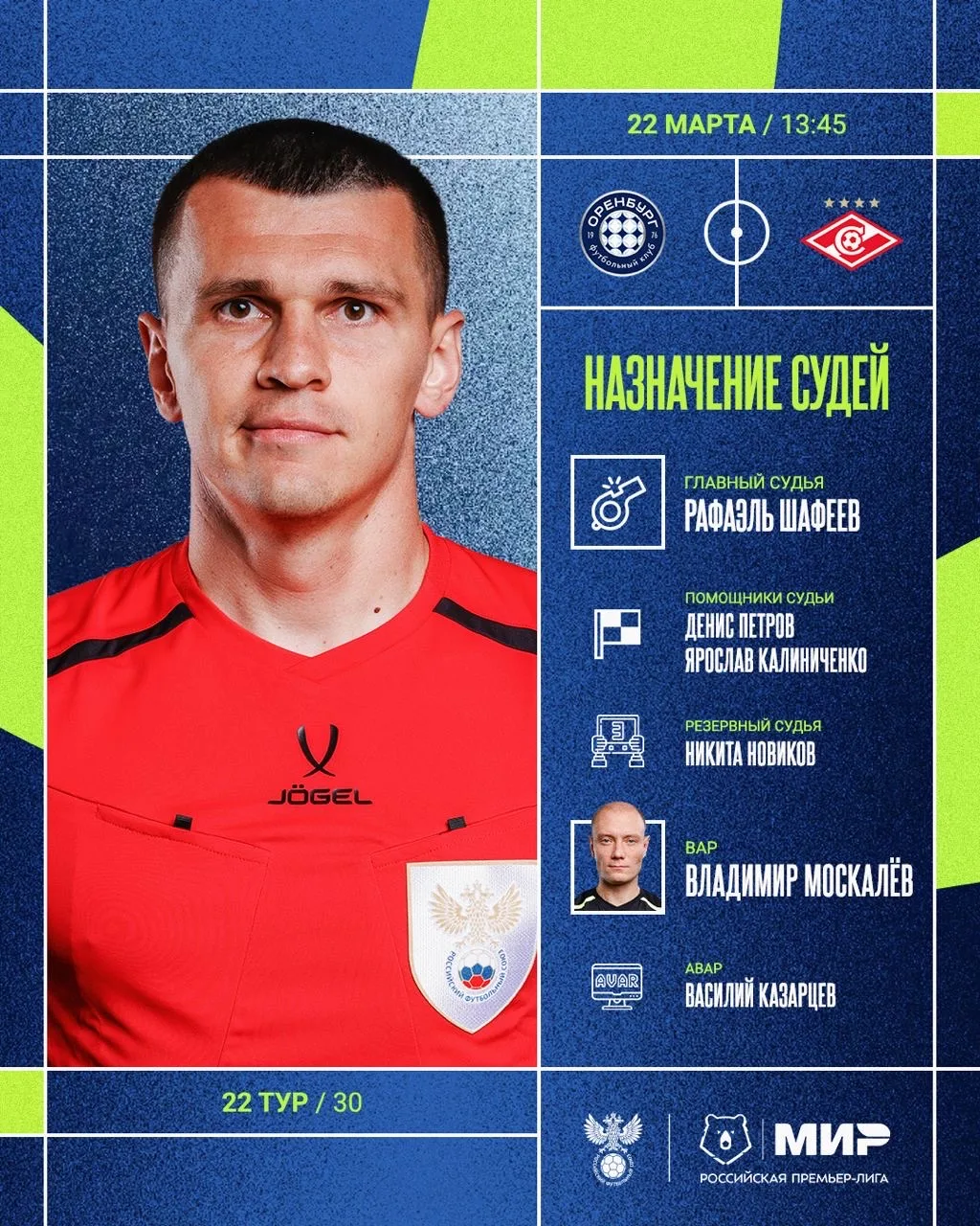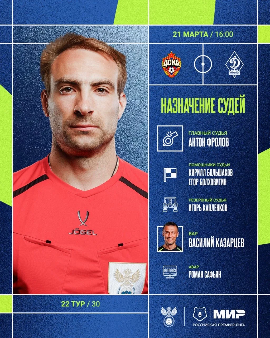 РФС публикует назначения арбитров на 22-й тур Мир РПЛ.