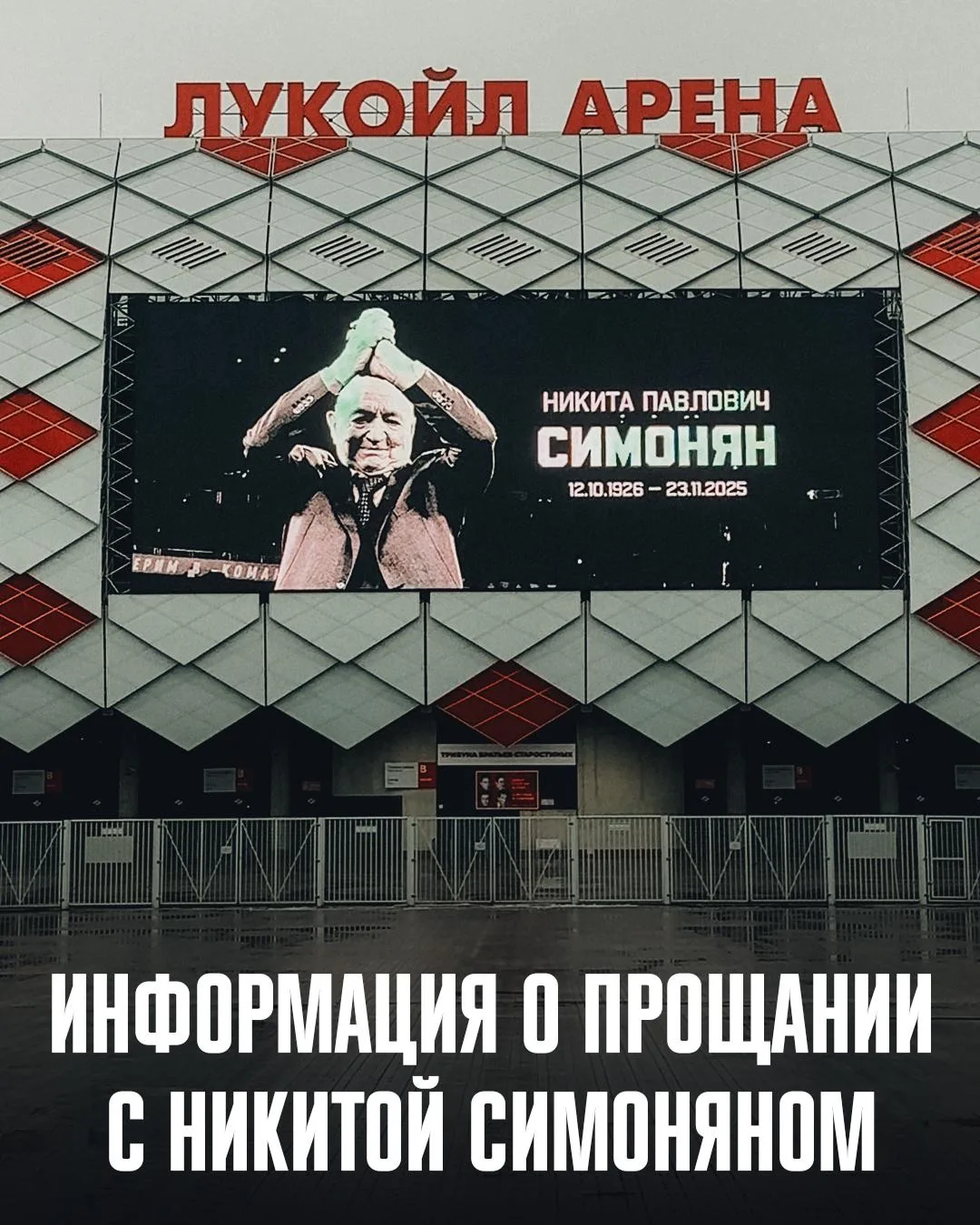 Прощание с Никитой Симоняном состоится 27 ноября 2025 года на стадионе «Лукойл Арена».