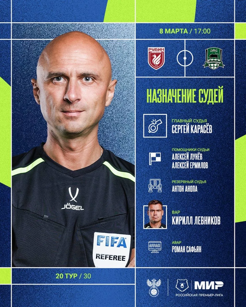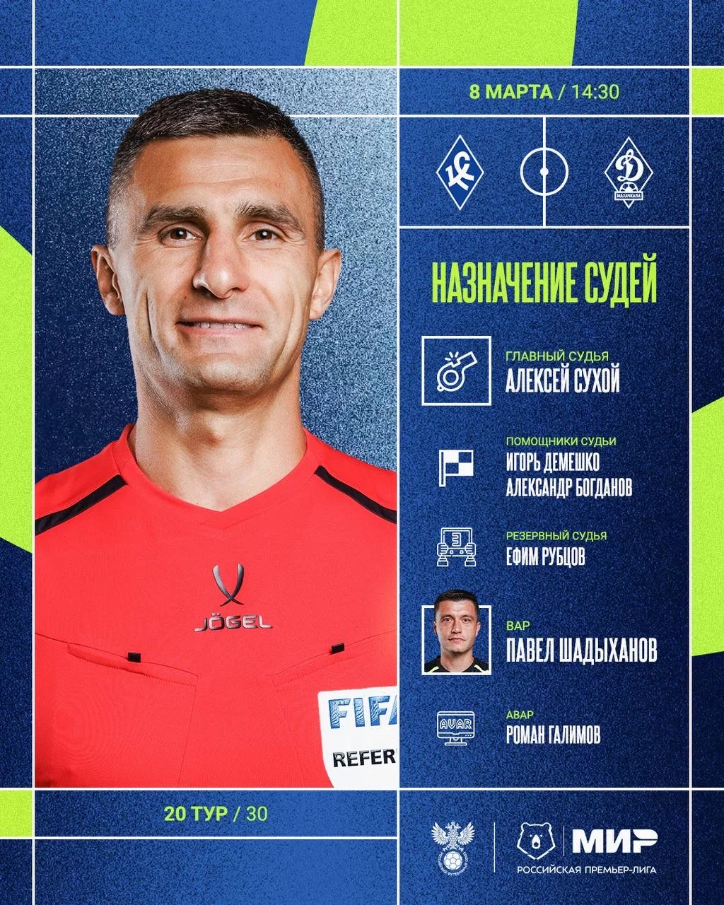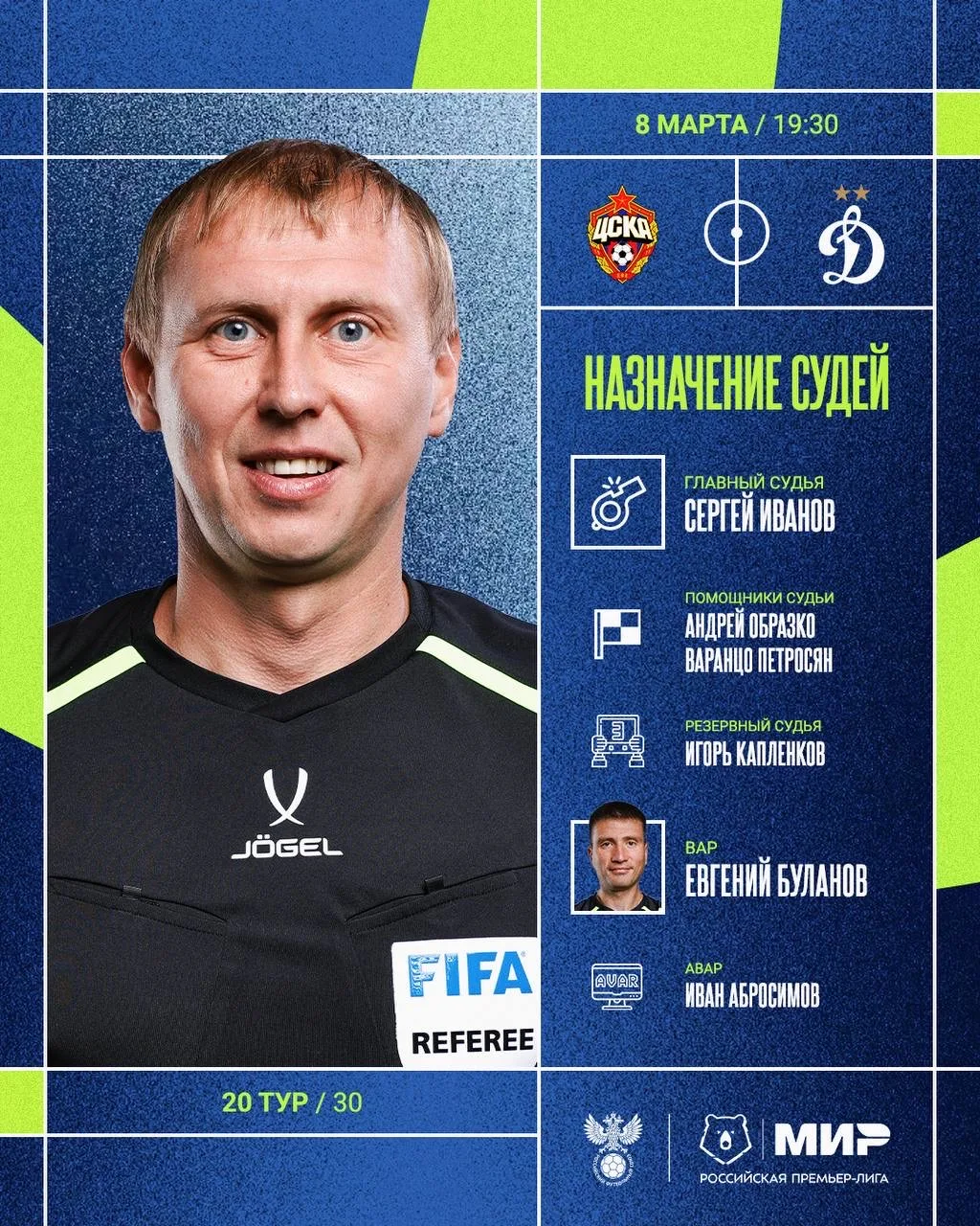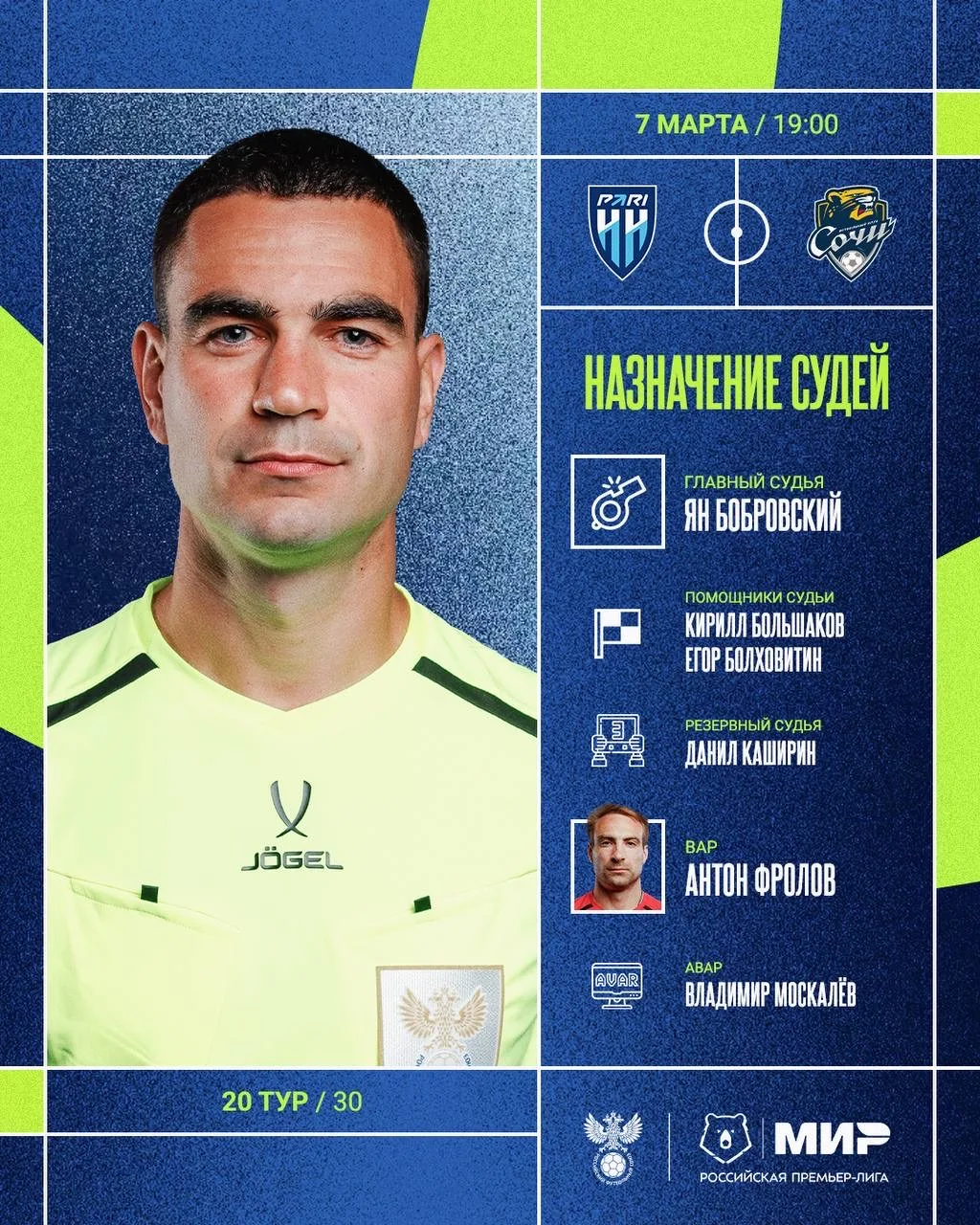 РФС публикует назначения арбитров на 20-й тур Мир РПЛ.