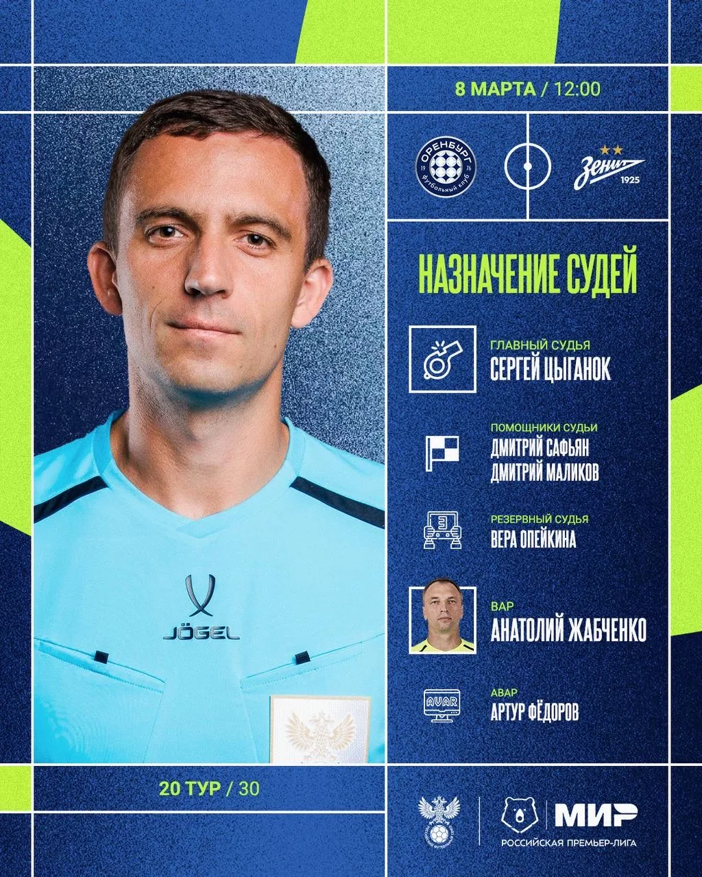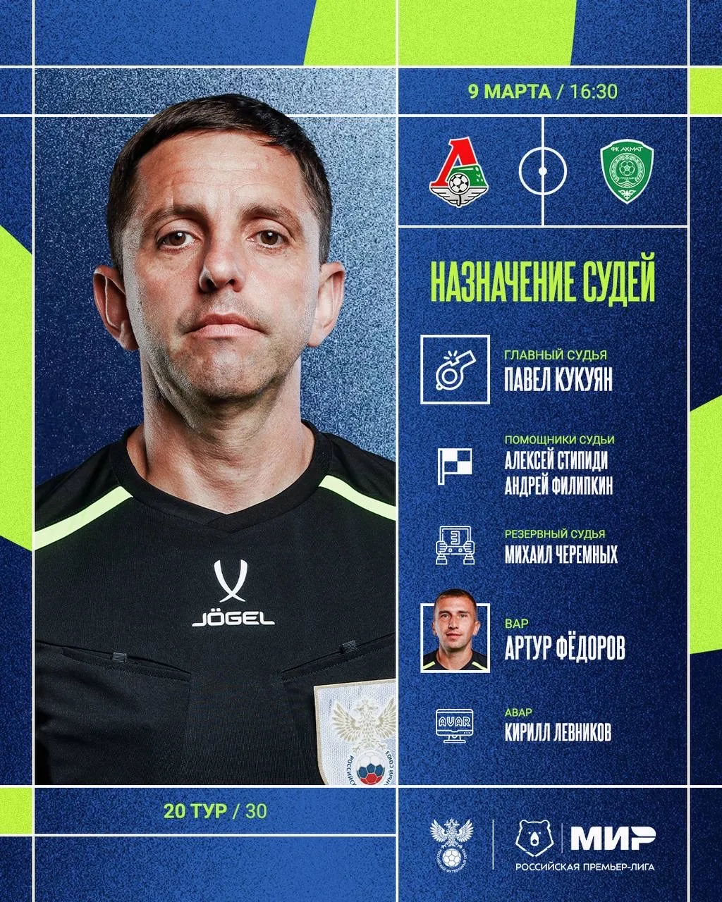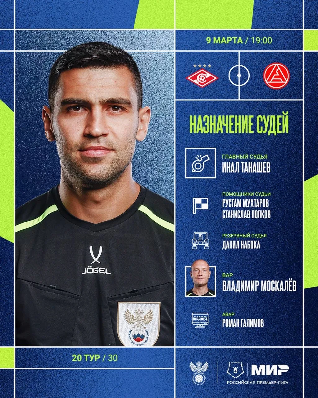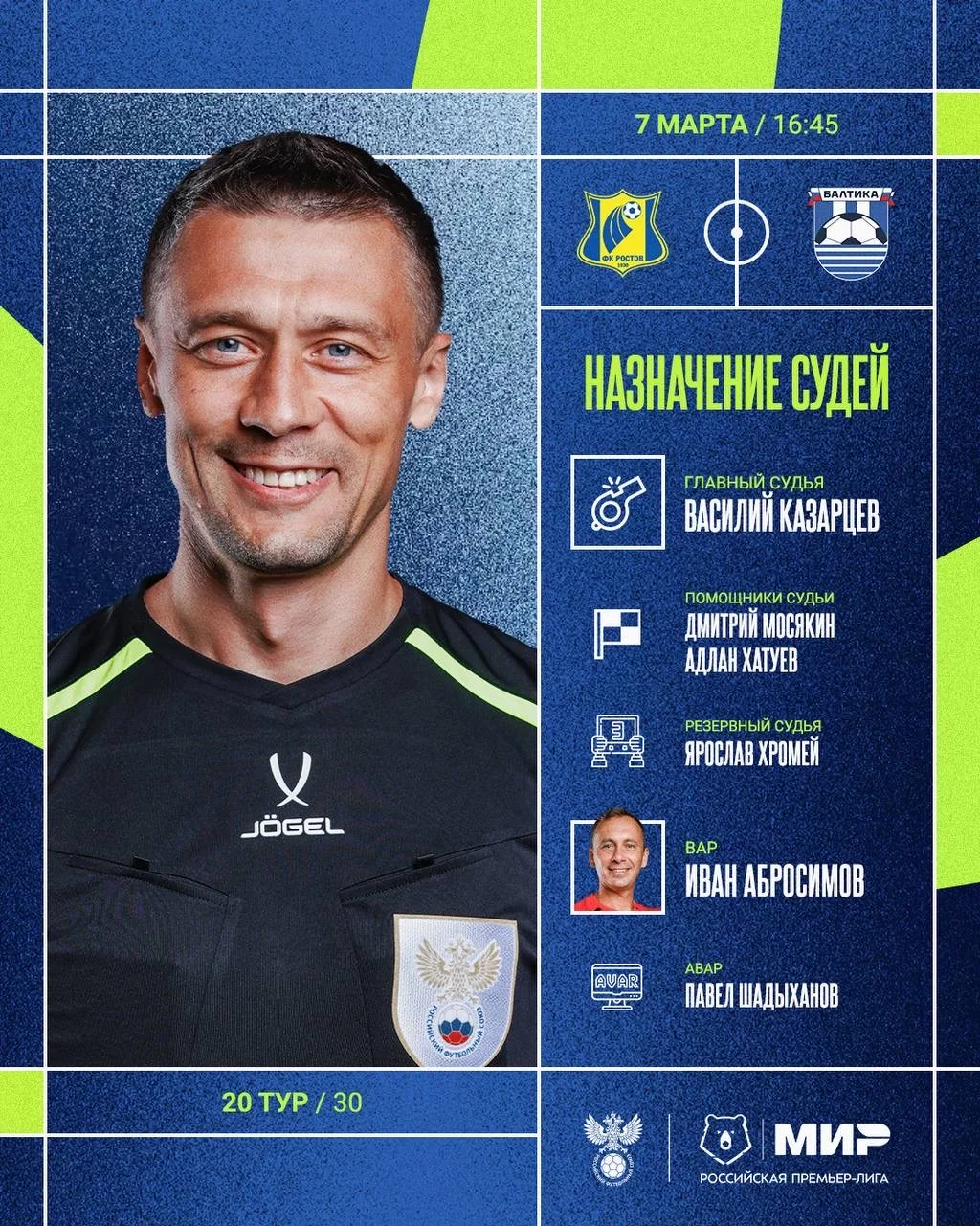 РФС публикует назначения арбитров на 20-й тур Мир РПЛ.
