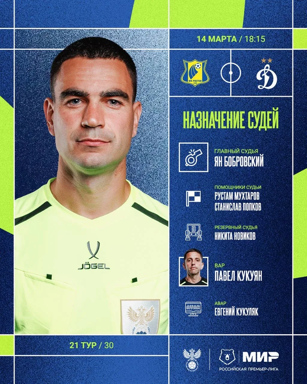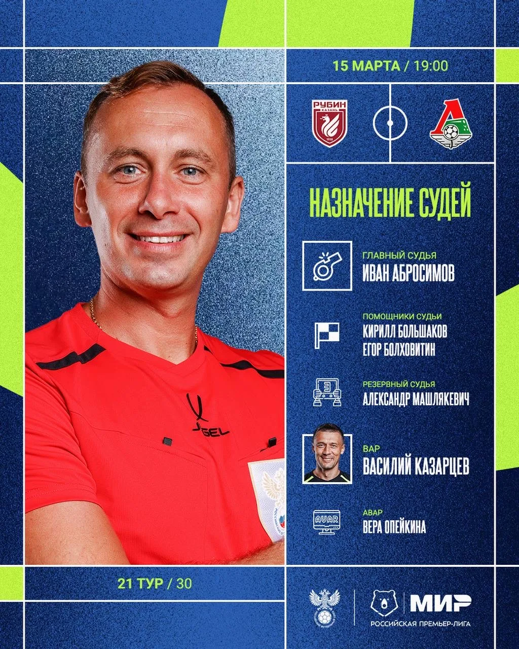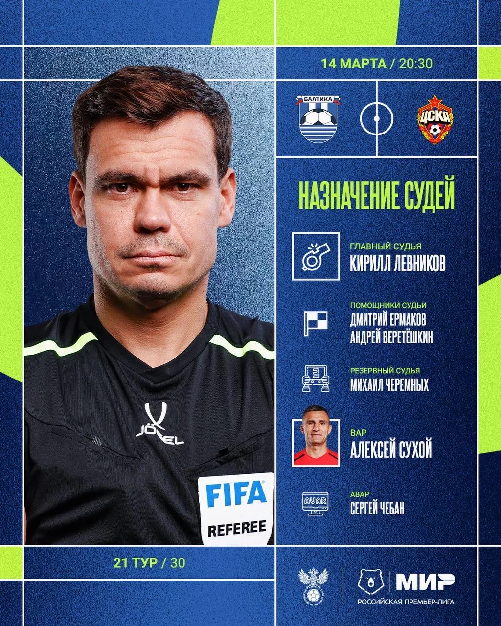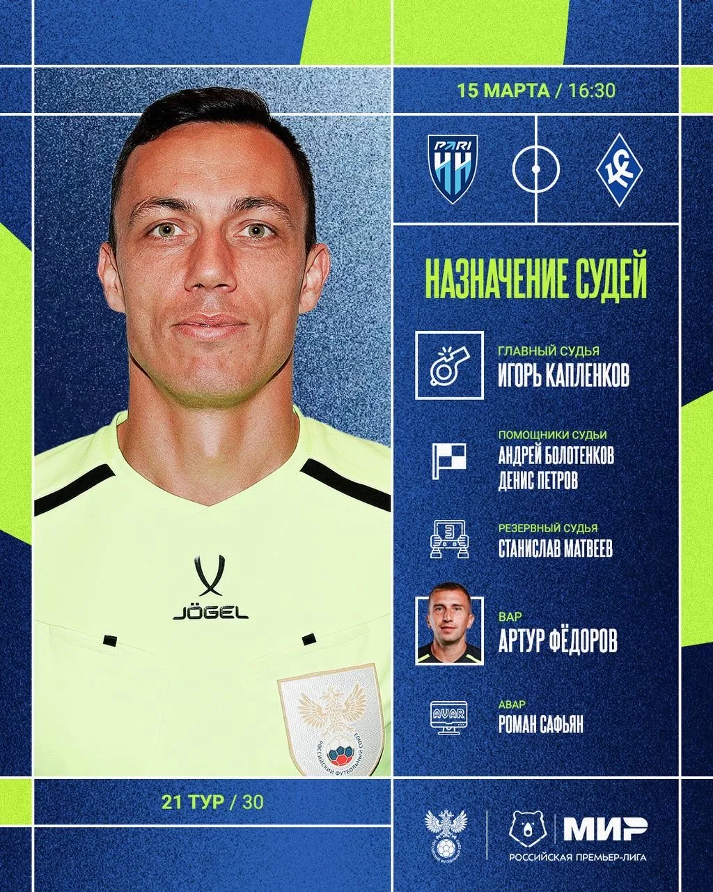 РФС публикует назначения арбитров на 21-й тур Мир РПЛ.