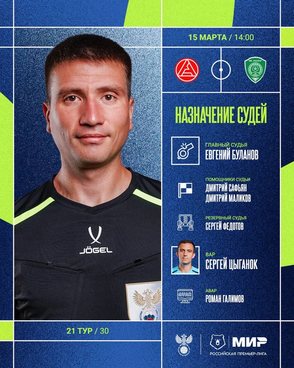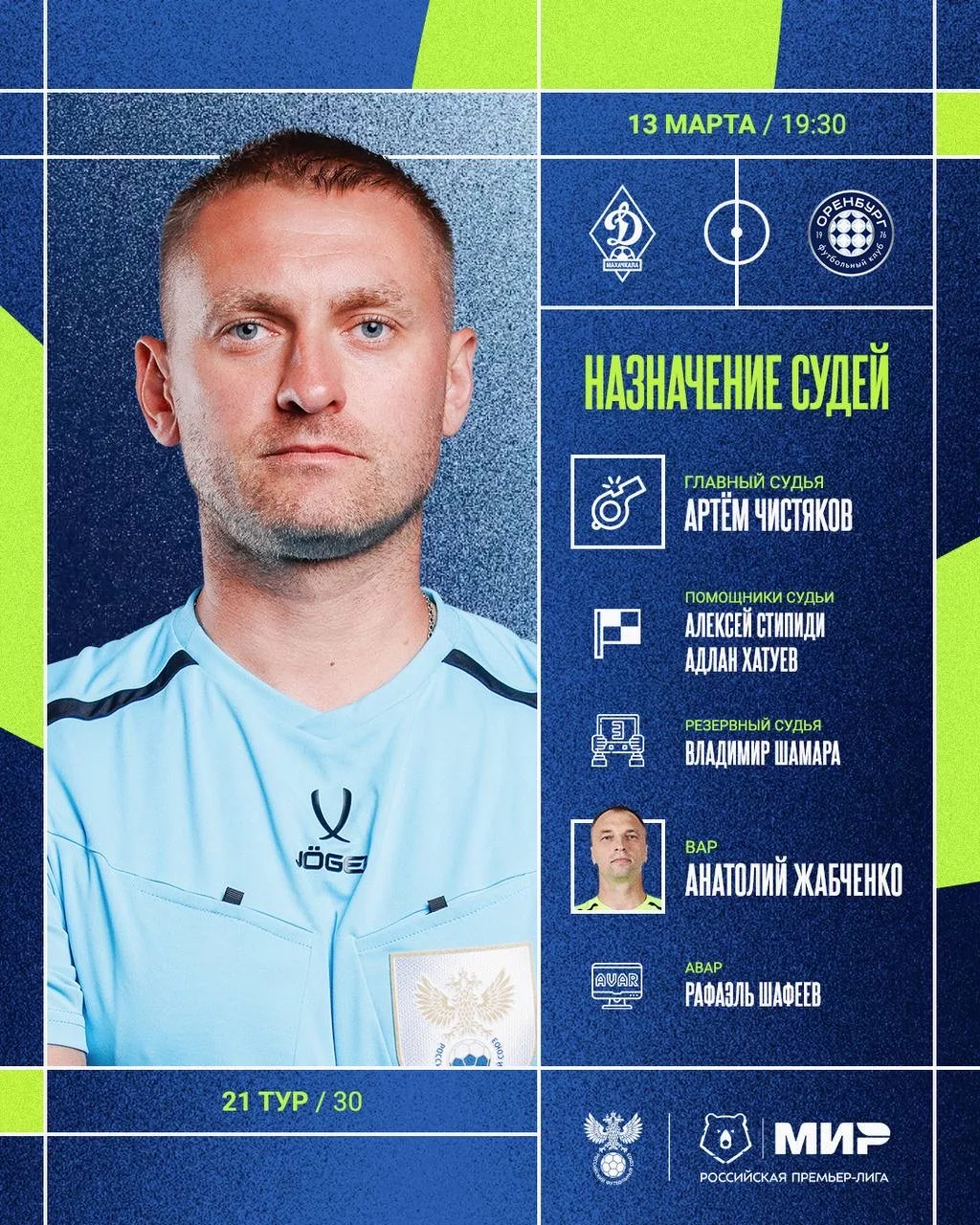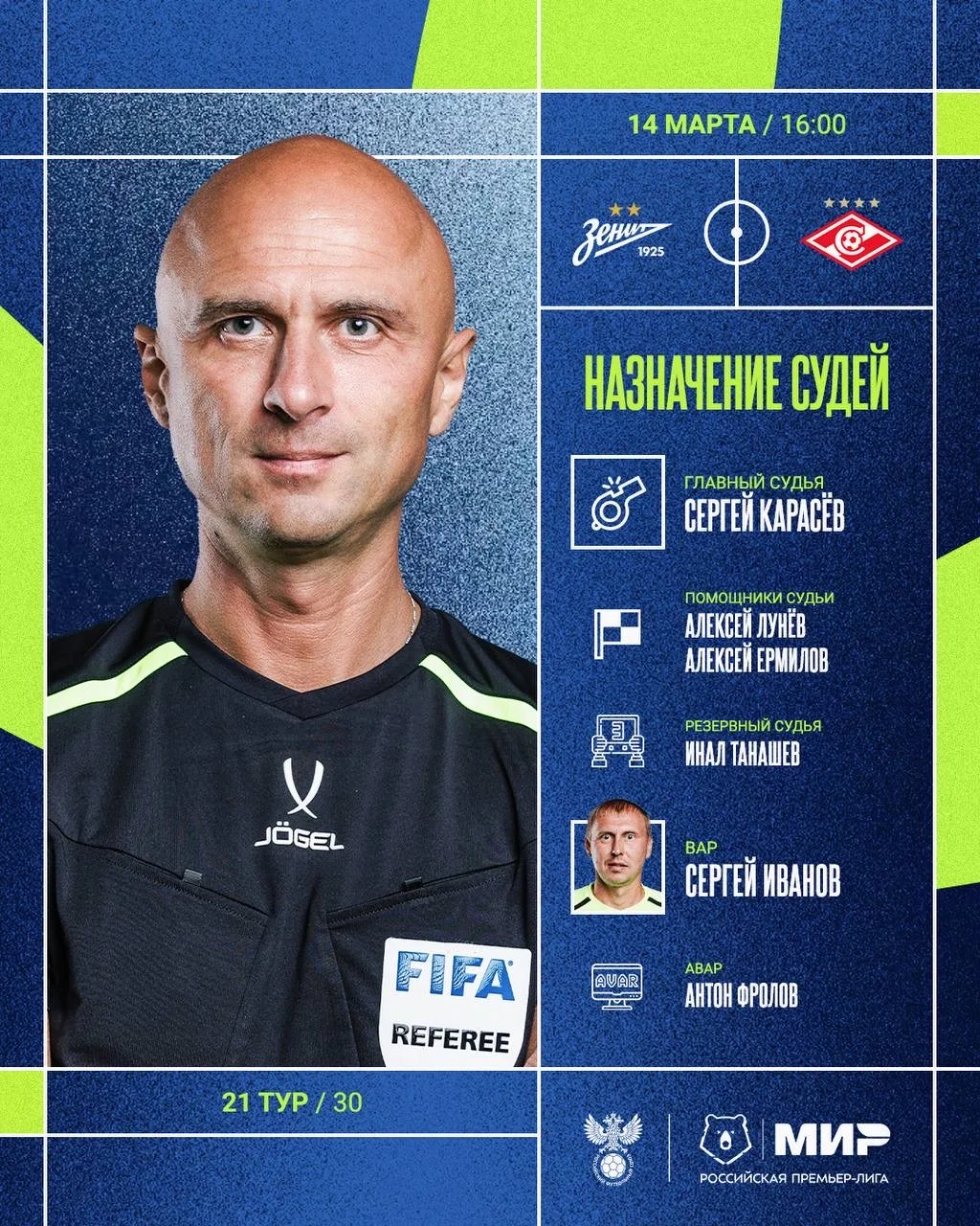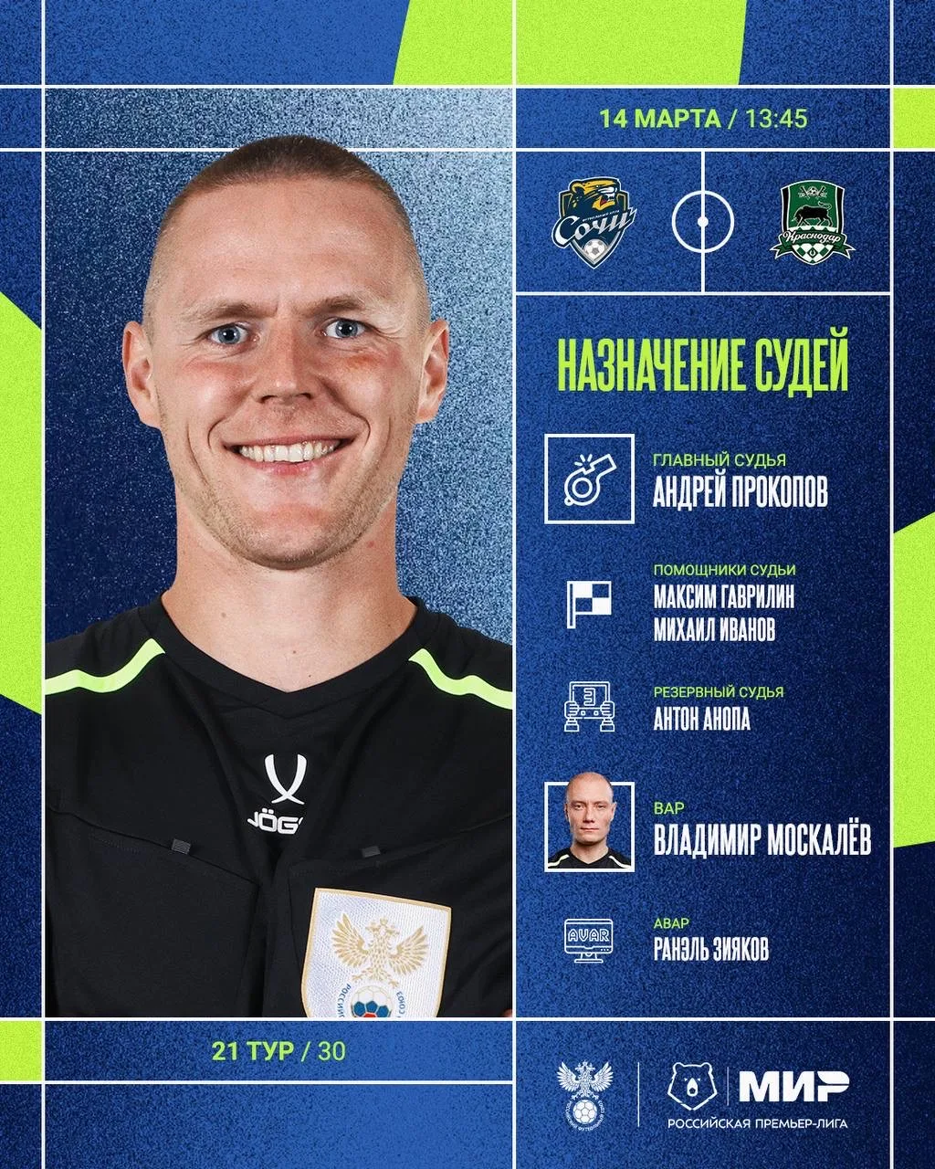 РФС публикует назначения арбитров на 21-й тур Мир РПЛ.