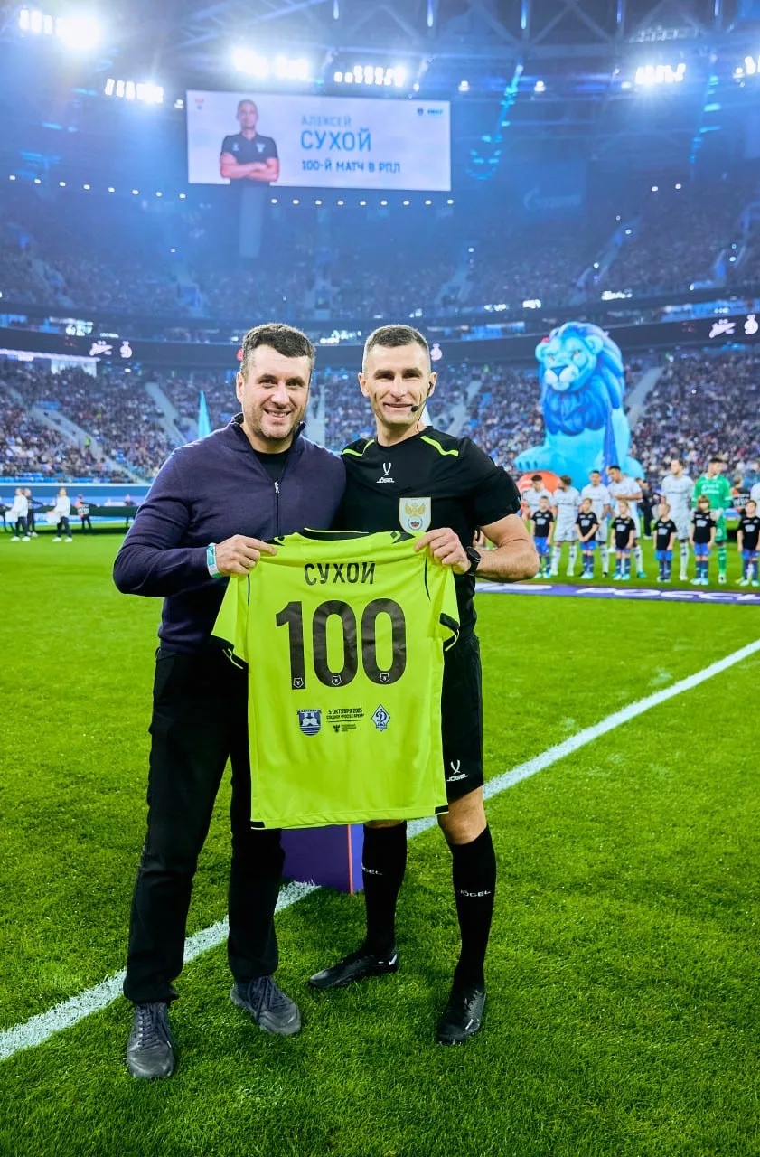 Председатель судейского комитета РФС Павел Каманцев поздравил Алексея перед матчем «Зенит» – «Динамо» (Москва) и вручил ему памятную футболку.