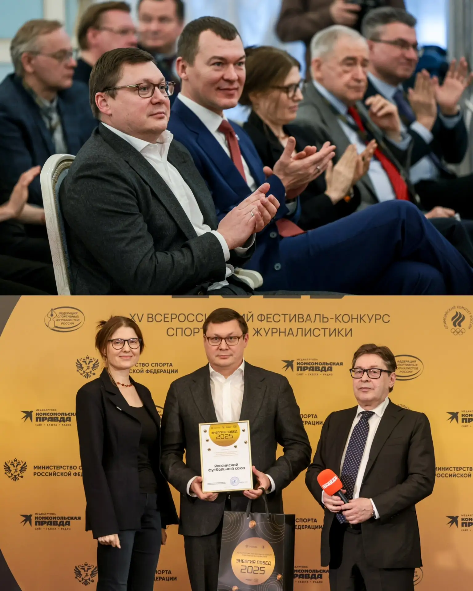 Приз генеральному секретарю РФС Максиму Митрофанову вручили главред «Комсомольской правды» Олеся Носова и президент Федерации спортивных журналистов России Дмитрий Тугарин.