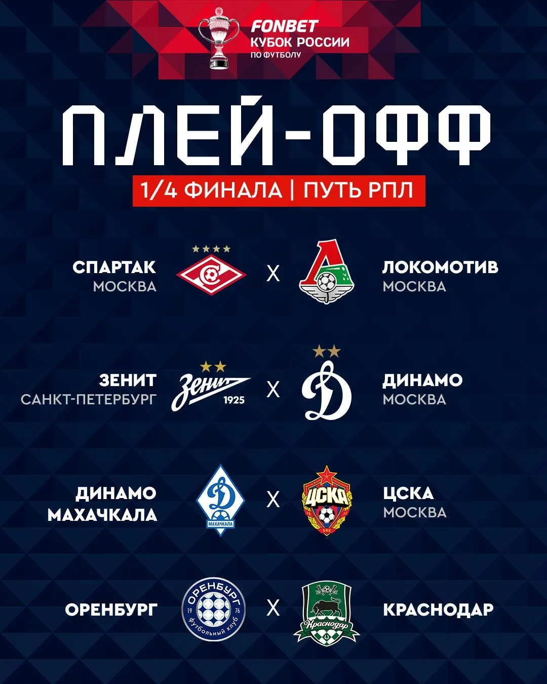 Сформировались пары плей-офф Пути РПЛ FONBET Кубка России. Матчи пройдут уже в ноябре.