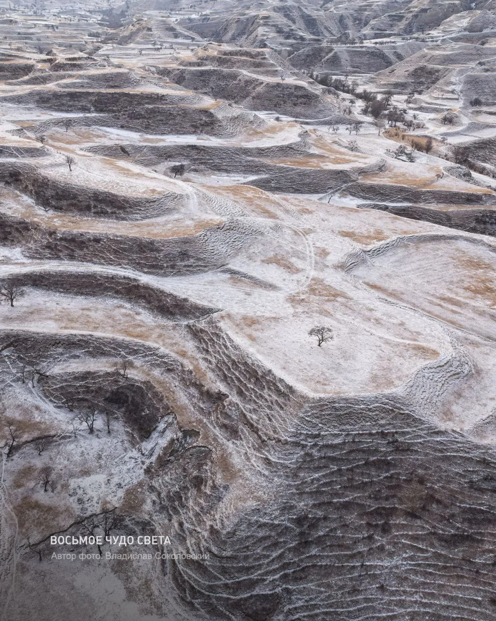 Если бы не снег, можно было бы подумать, что это — китайские рисовые поля. Однако это — земледельческие террасы в Дагестане.