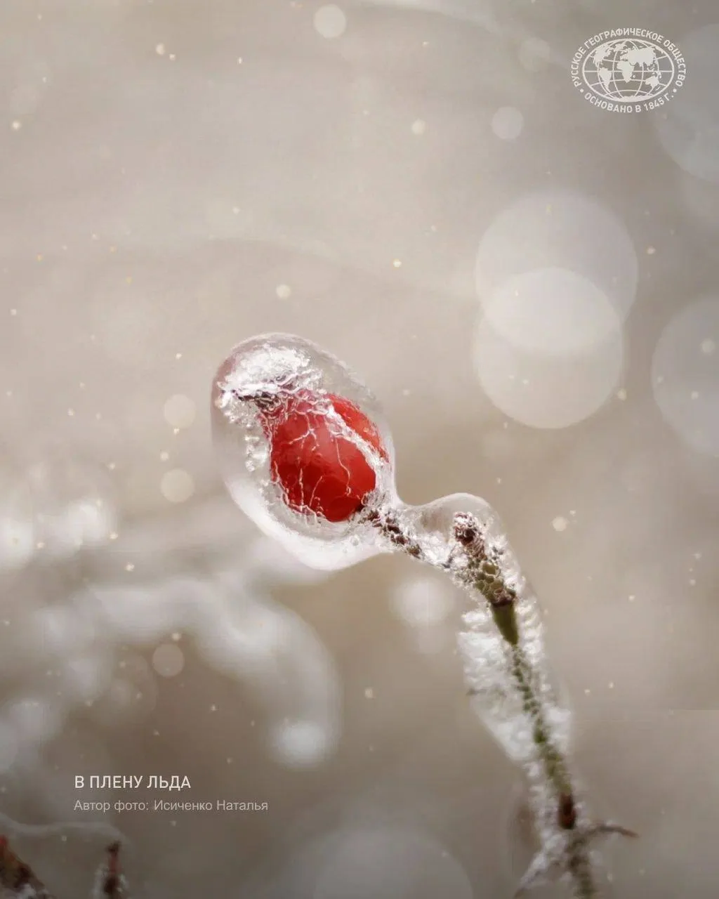 В начале зимы ледяной дождь — не редкость. Всё оказывается в плену льда. Даже эта ягодка шиповника.