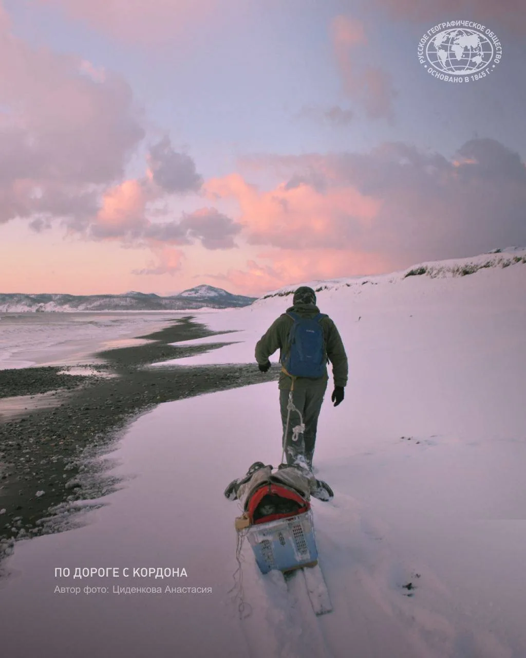 «Пока мы работали там в декабре 2021 года, на острове выпал снег, и транспорт до нас добраться уже не мог. Было 25 декабря, Новый год хотелось встретить в цивилизации со связью, мандаринами и шампанским, поэтому было принято решение пройти пешком 20 км до ближайшей возможной точки перехвата нас автомобилем. Рассвет мы встретили на берегу Южно-Курильского пролива рядом с мысом Геммерлинга. С собой: самодельные санки из старых лыж и рыболовной корзины, выловленной на берегу пролива, а ещё болотные сапоги для брода через реки и две кошки».