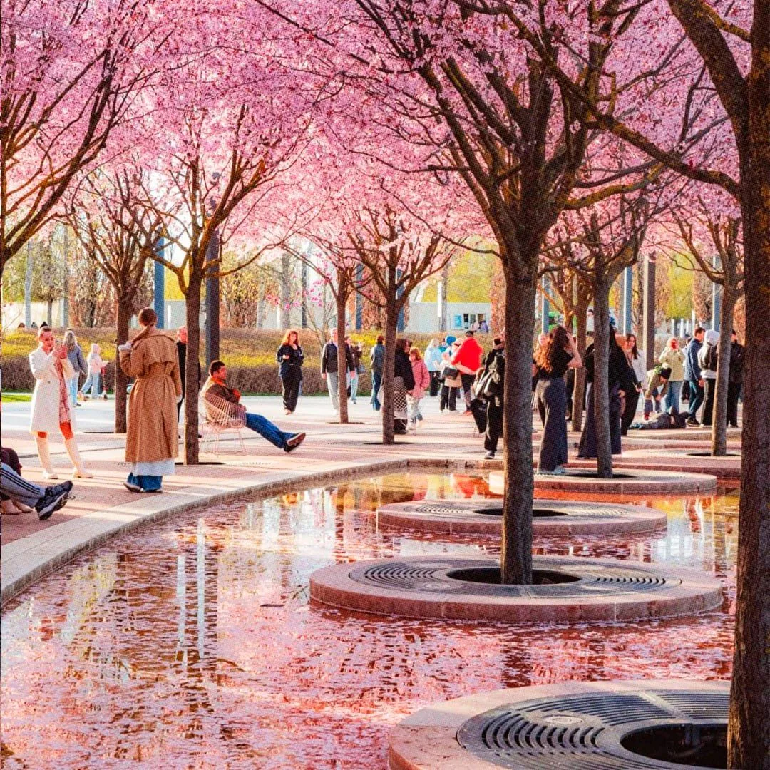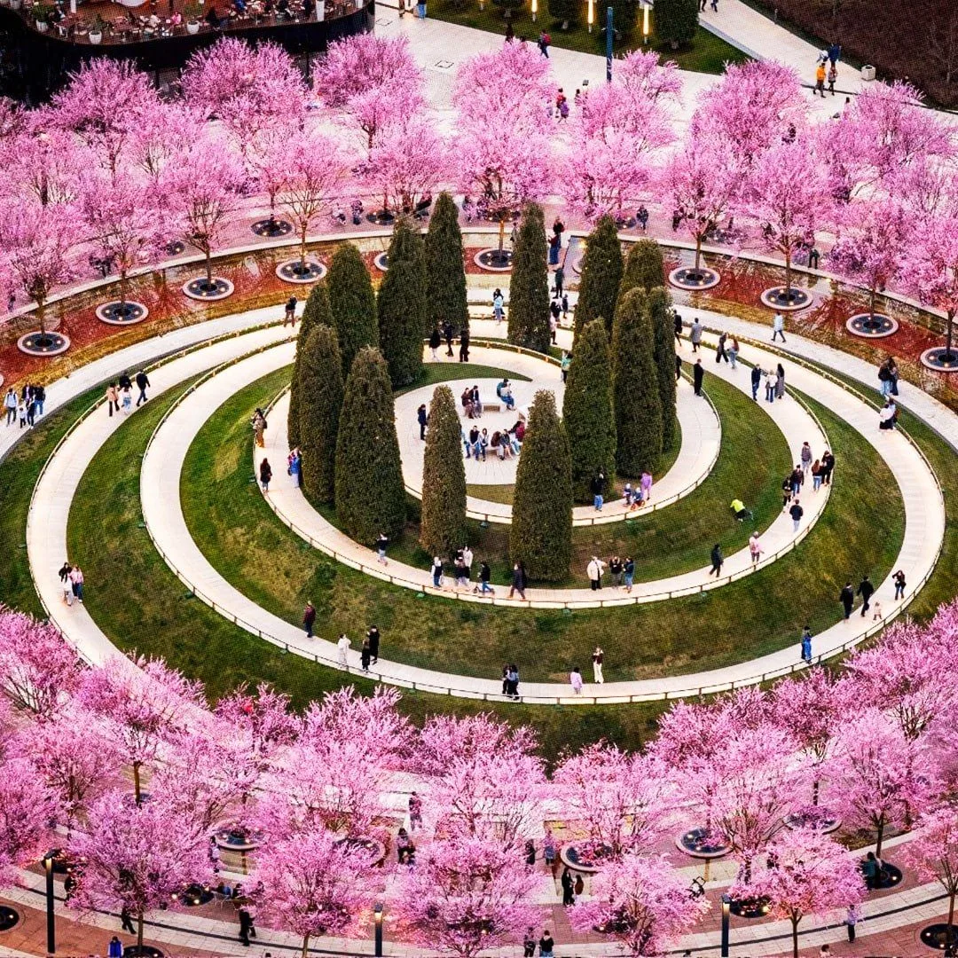 Деревья с ярко-розовыми листьями визуально напоминают сакуру, из-за чего парк сейчас выглядит как кадр из японского аниме. Соцсети уже заполонили шикарные фотографии