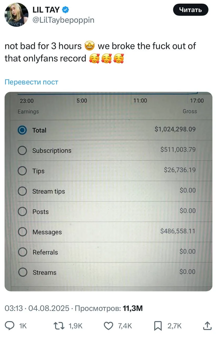 «Мы побили этот чертов рекорд OnlyFans» — написала девушка в своих соцсетях, хвастаясь результатами. По словам самой блогерши, весь доступный материал был снят ровно в 00:01 — сразу после её 18-летия