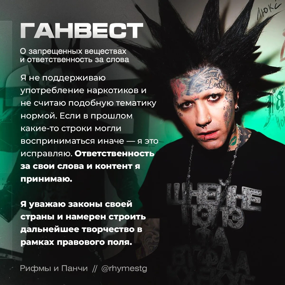 Он принял решение зацензурить и переработать часть своих треков, чтобы соответствовать требованиям законодательства РФ. Руслан уточнил, что принимает ответственность за свои слова и контент. Также он заявил, что не поддерживает употребление наркотиков и не считает это нормой