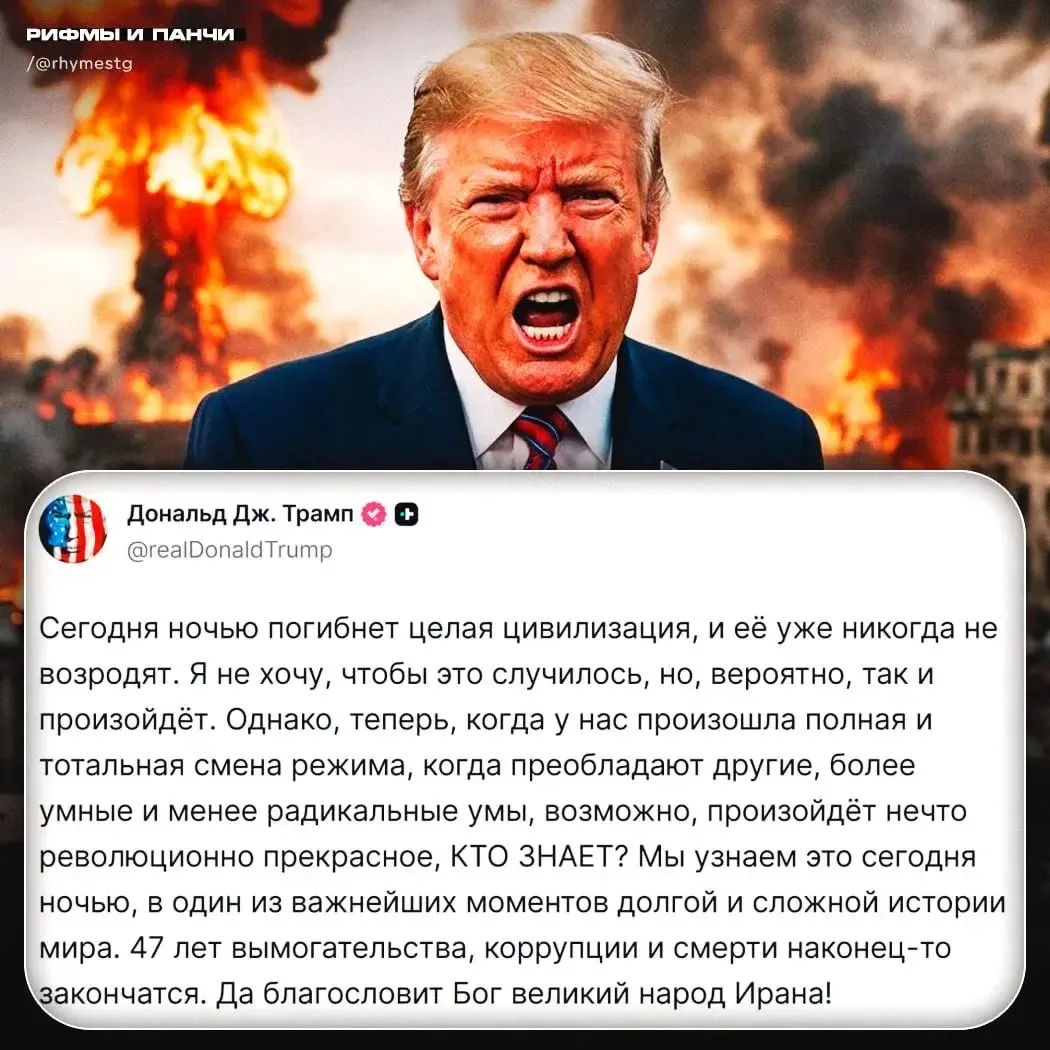 ‼️ «Сегодня ночью ПОГИБНЕТ ЦЕЛАЯ ЦИВИЛИЗАЦИЯ, и её уже никогда НЕ возродят» — такое заявление сделал Трамп