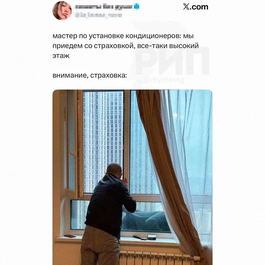 Мем дня: девушка вызвала мастера по установке кондиционера, а тот предупредил, что приедет со страховкой 😁