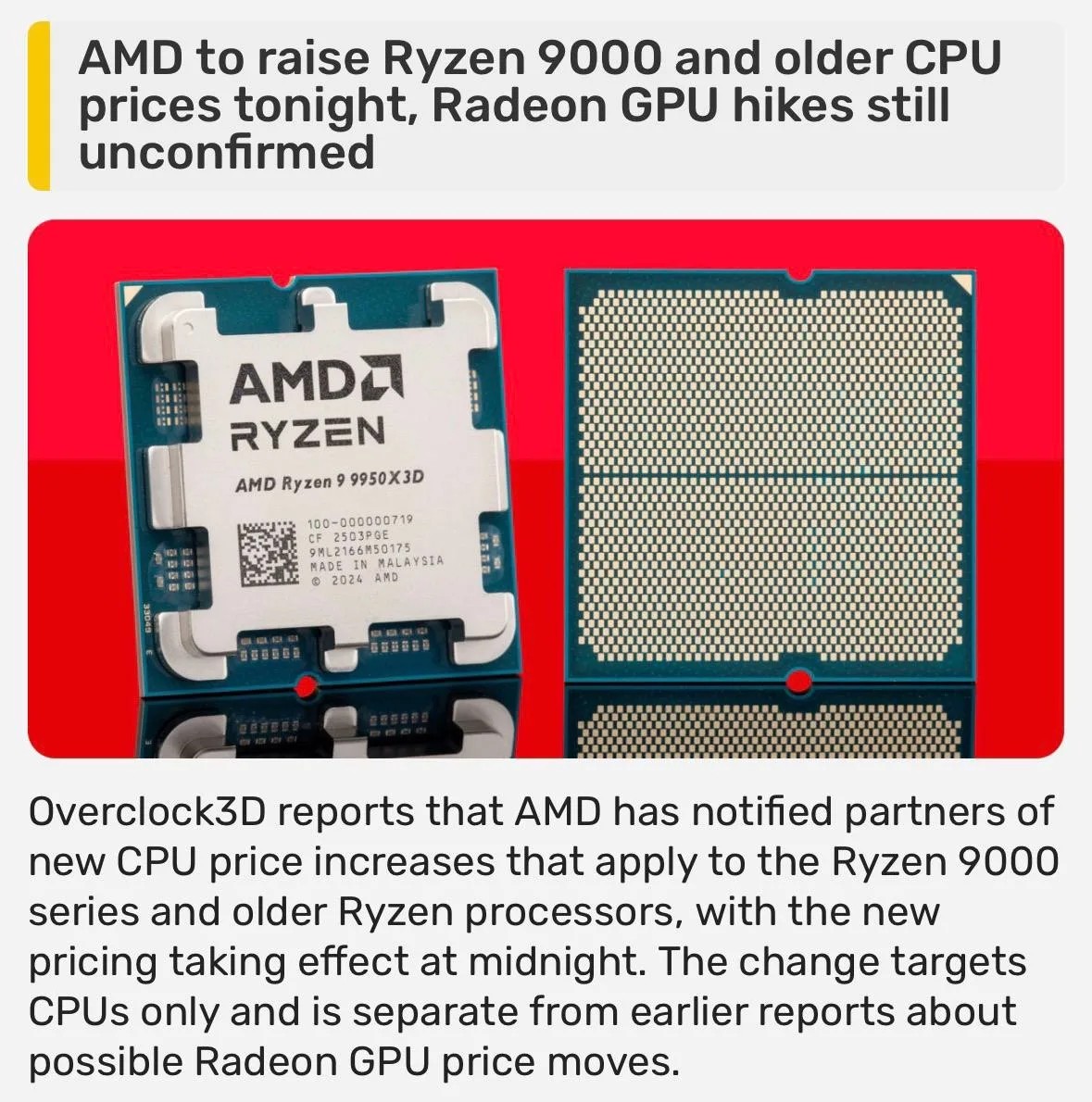 Как сообщает Overclock3D, AMD официально уведомила своих партнёров о новом повышении цен на процессоры серии Ryzen 9000 и более ранние модели Ryzen
