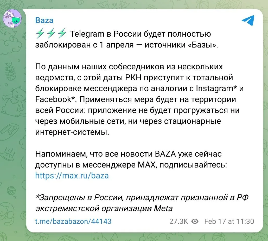 Напомним: блокировка ТГ запланирована на 1 апреля и будет действовать по всей России, аналогично Instagram* и Facebook*