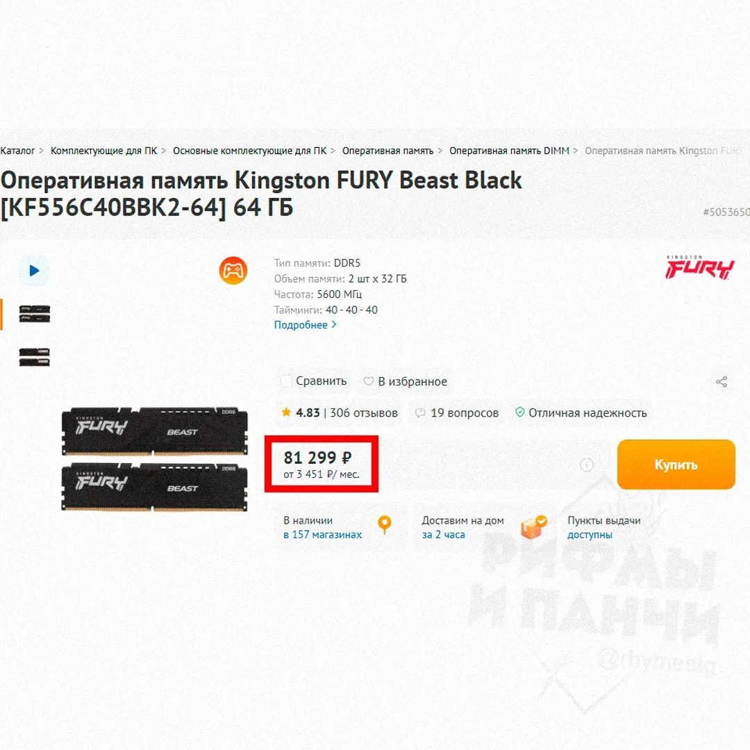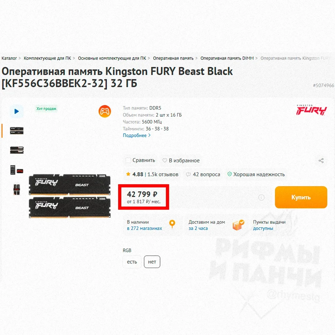 Прайс на оперативку вырос буквально за пару дней в 2-3 раза! Если Kingston FURY Beast Black поколения DDR5 на 32гб еще в середине ноября стоила 15-18 тысяч рублей, вчера — 24к, то сейчас ее цена уже в районе 42 ТЫСЯЧ РУБЛЕЙ!