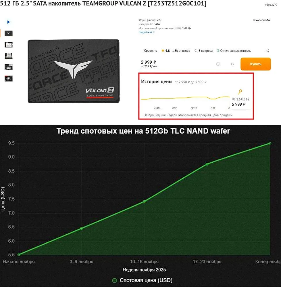 ⚡️ Цены на SSD ВЗЛЕТЯТ вслед за ценами на ОЗУ — за ноябрь контрактные цены чипов TLC NAND выросли на 20-60%, а спотовые цены — на 50-80%