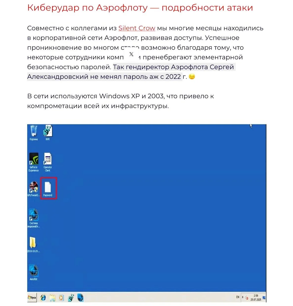 ⚡️ Глава «Аэрофлота» НЕ МЕНЯЛ ПАРОЛЬ с 2022 года, а инфраструктура компании работала на УСТАРЕВШИХ ВЕРСИЯХ Windows XP и 2003, заявляют хакеры