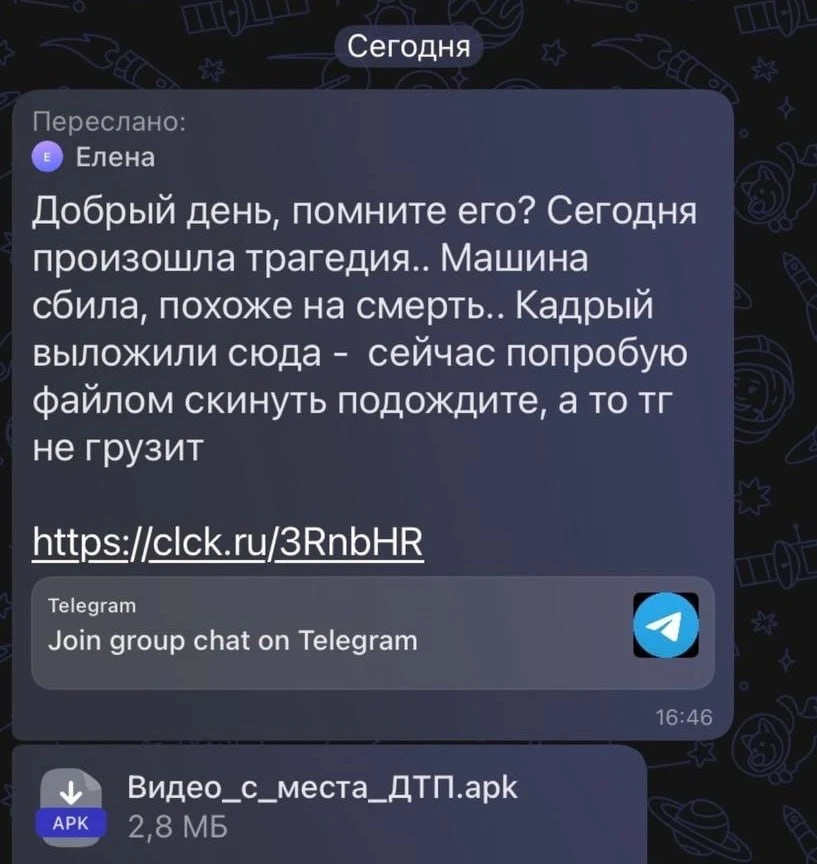 Злоумышленники взламывают аккаунты и рассылают от имени знакомых видео с якобы попавшим в ДТП человеком. На самом деле это не видео, а вредоносный файл в формате .apk - установочный пакет для Android.