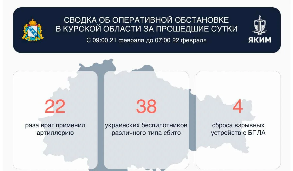 Всего в период с 09:00 21 февраля до 07:00 22 февраля сбито 38 вражеских беспилотников различного типа. 22 раза враг применил артиллерию по отселённым районам. 4 раза беспилотники атаковали нашу территорию с помощью сброса взрывного устройства.