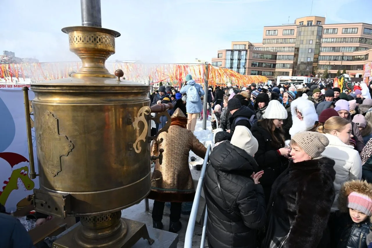 🫖На территории расположили колоритные фотозоны с матрешками и вышитыми плетнями, а у самого большого самовара всех угощали горячим травяным чаем и блинами. Праздничное настроение создавали выступления фольклорного проекта «Культурное достояние», хора «Соловейко» и ансамбля «Досуг», которые исполнили народные песни и хиты прошлых лет.