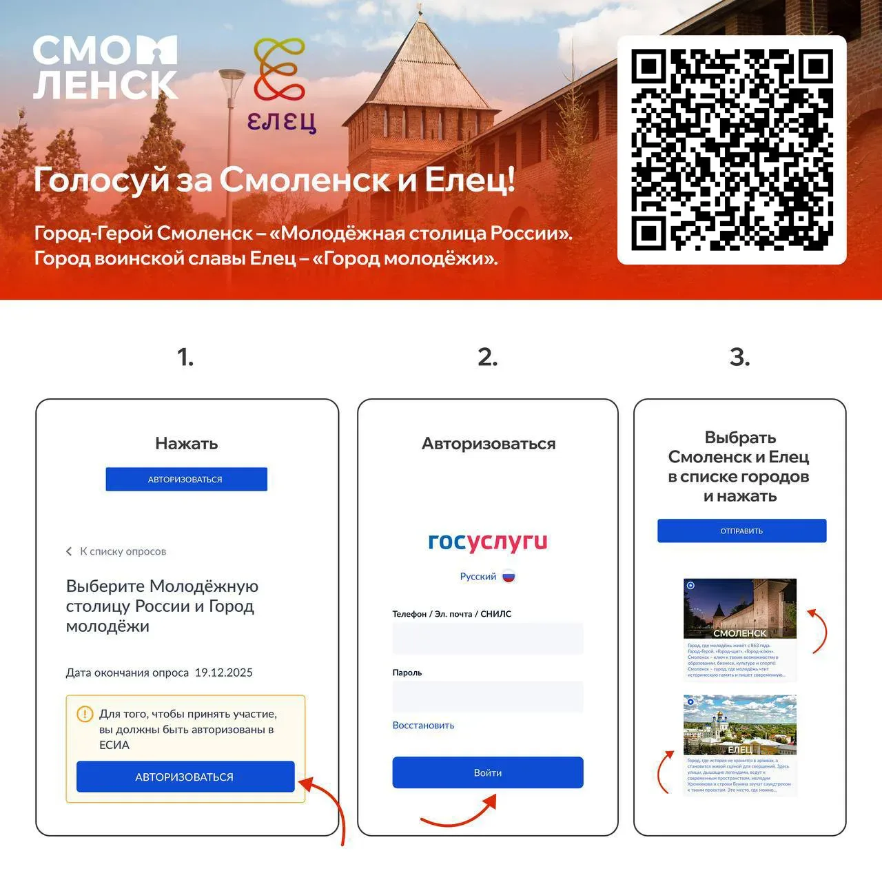 С 1 по 19 декабря 2025 года на портале «Госуслуги» проходит народное голосование за звания «Молодёжная столица России — 2026» и «Город молодёжи».