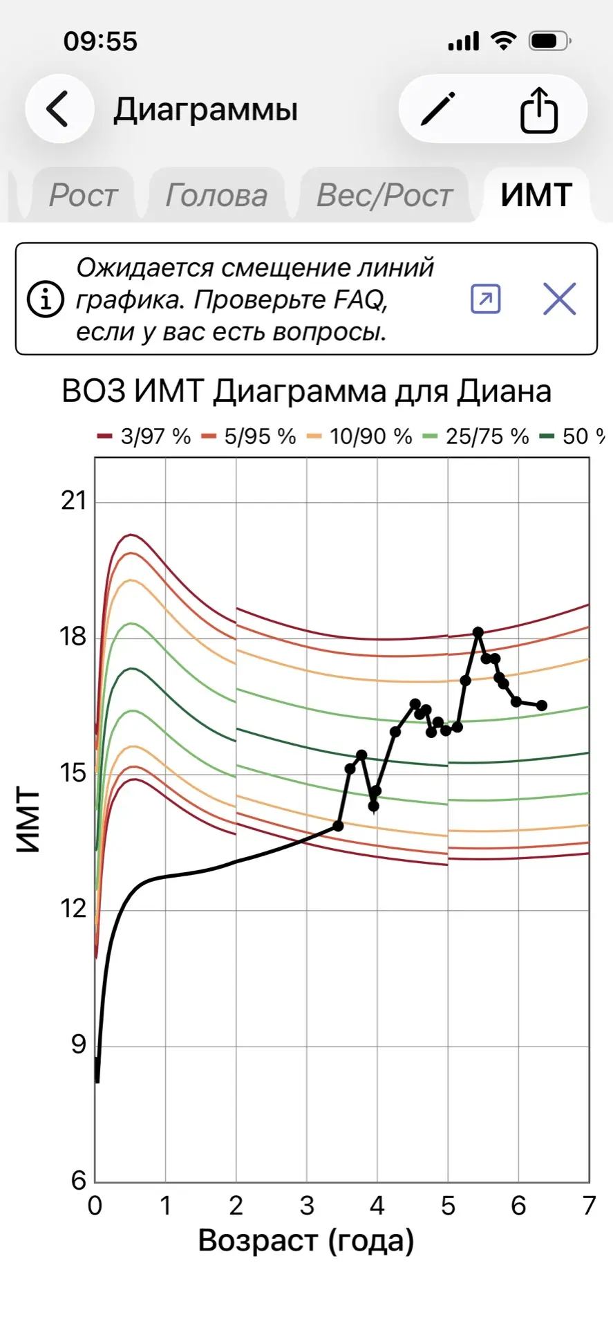 Это график Дианы. Нам удалось найти этот баланс и за год она прибавила в весе 0,5 кг, а в росте 7 см и сейчас у нее нормальный вес.