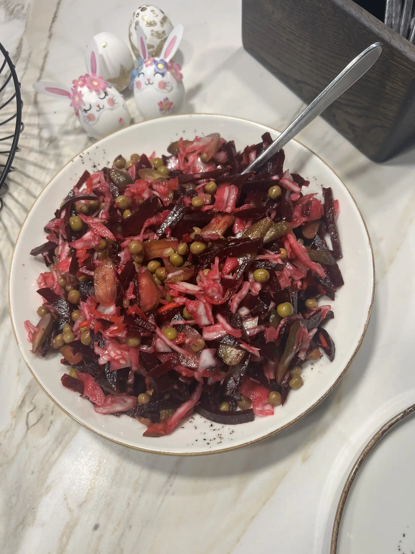 На ужин была копченая скумбрия, отварной картофель, салат из вареной свеклы и сухофрукты к чаю.
