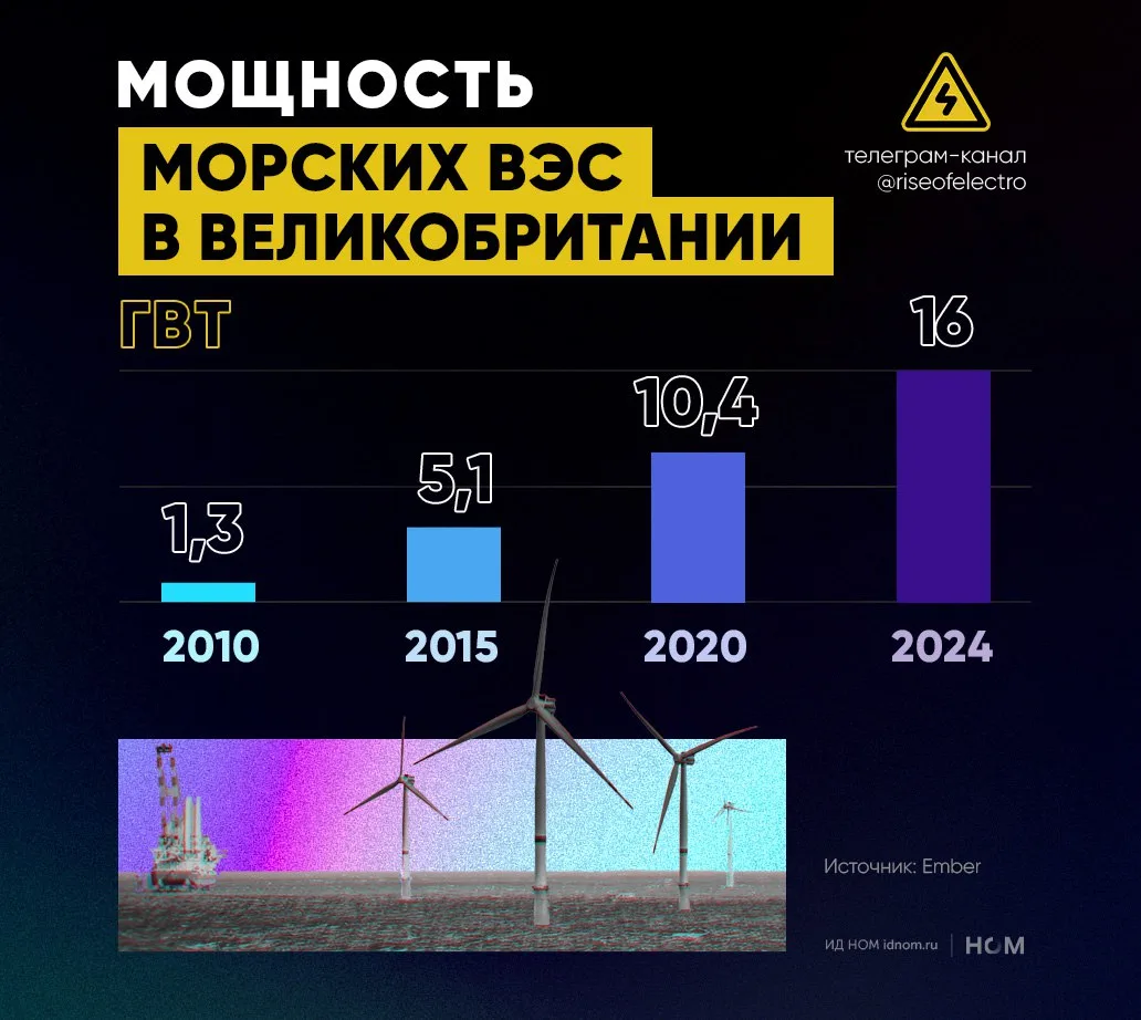 По данным Ember, установленная мощность морских ВЭС в Великобритании выросла с 4 МВт в 2000 г. до 1,3 ГВт в 2010 г. и 16 ГВт в 2025 г.