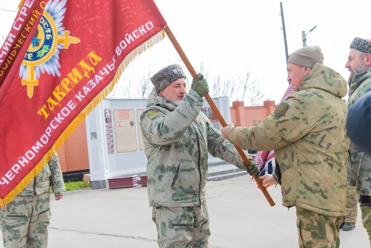 🇷🇺 В рамках мероприятия состоялся ритуал прибивки, церемония освящения и вручения знамени 7-му казачьему стрелковому батальону «Таврида» Добровольческого отряда «БАРС – Крым». Также бойцы казачьего батальона «Таврида» приняли воинскую присягу.